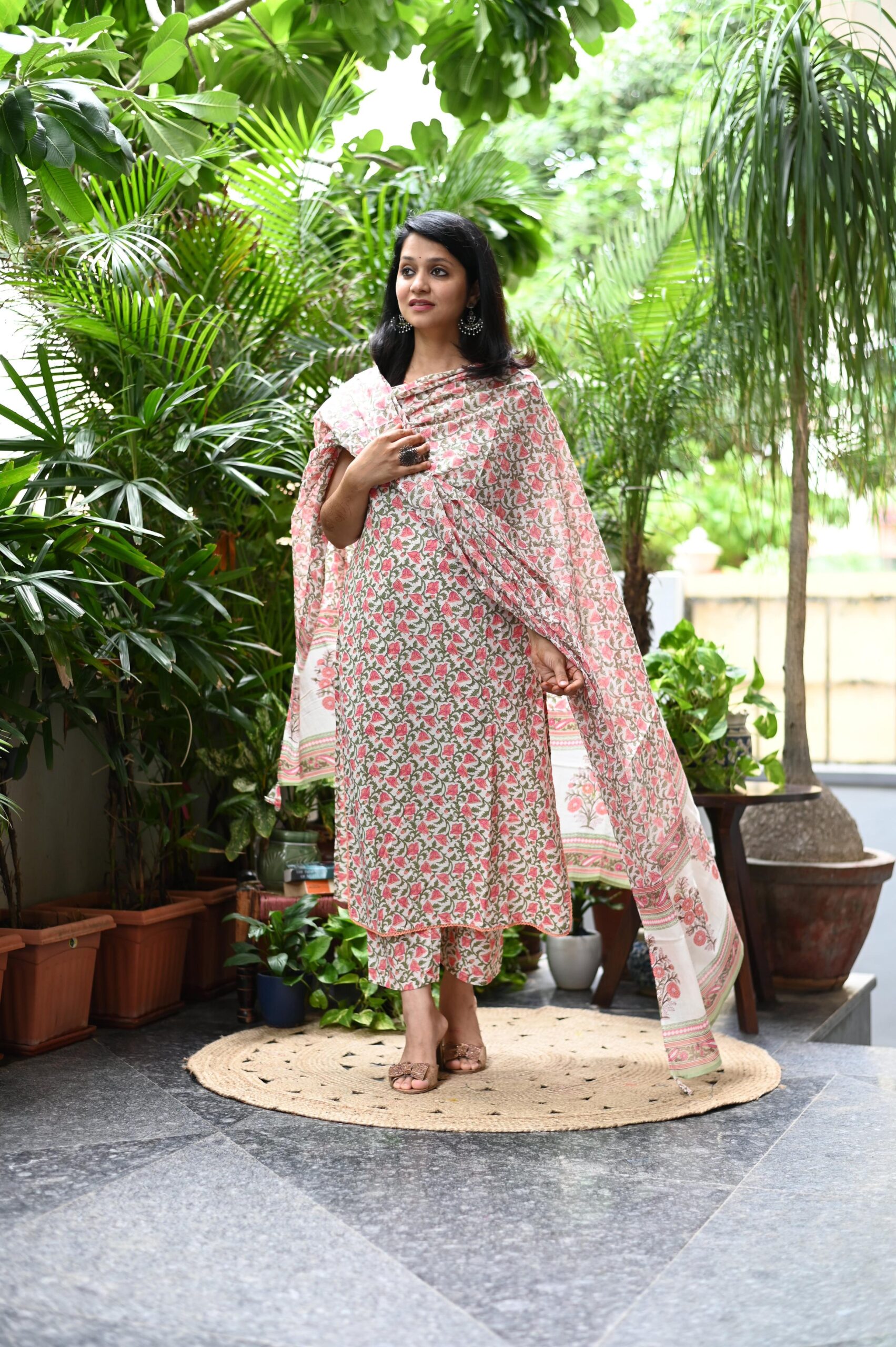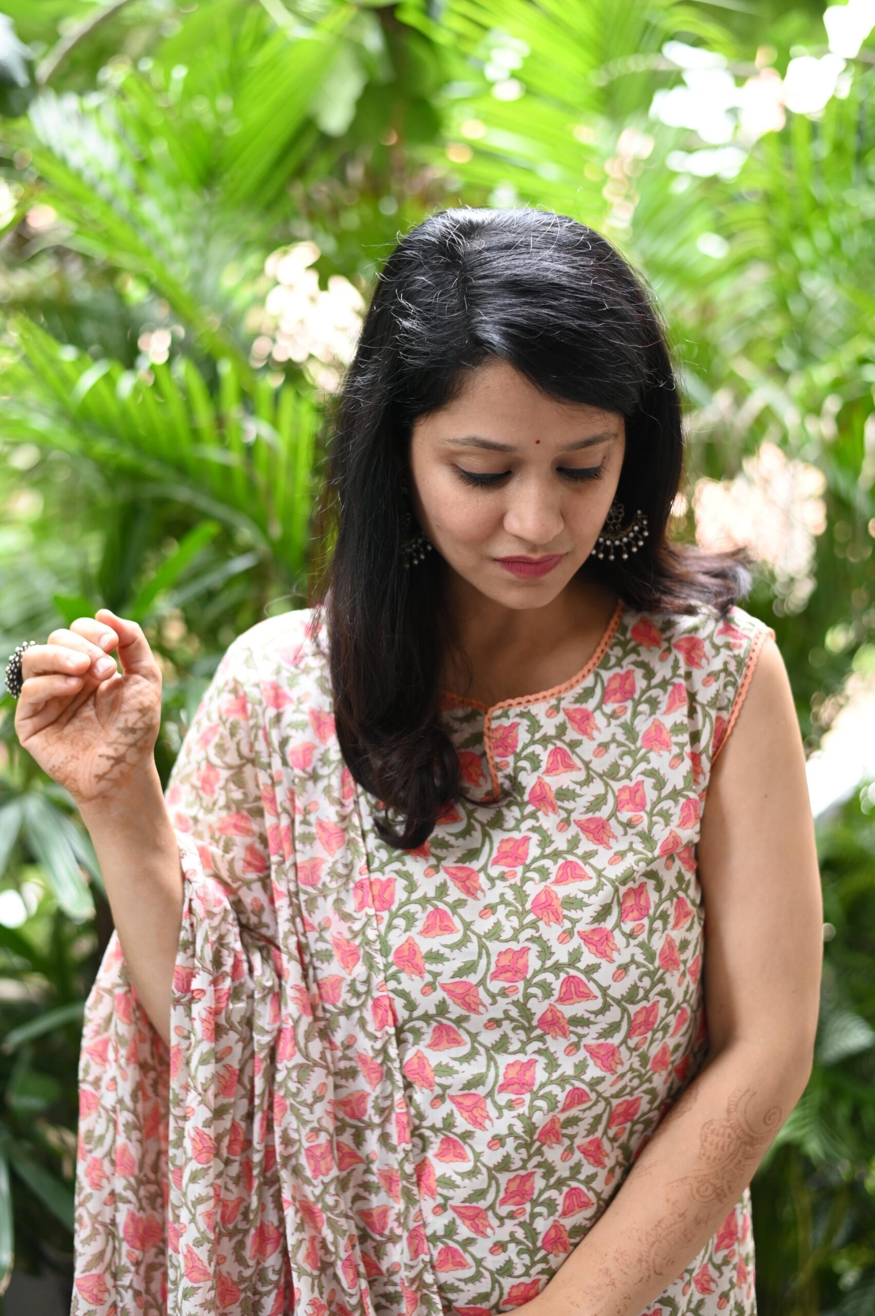 Sleeveless Hand block Cotton Suit Set, meticulously crafted from 100% pure cotton for unparalleled comfort and breathability, featuring a stunning hand look floral print design