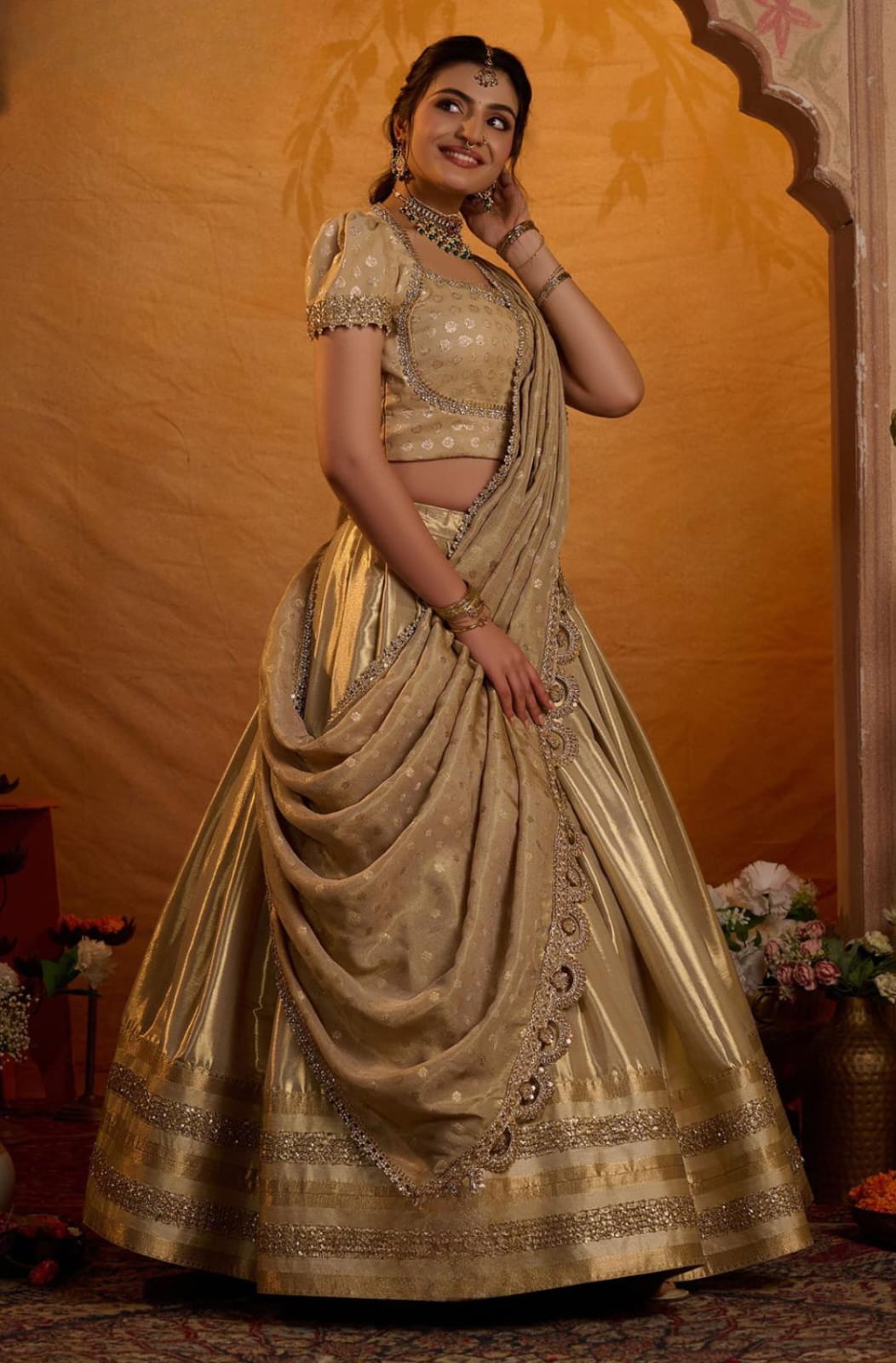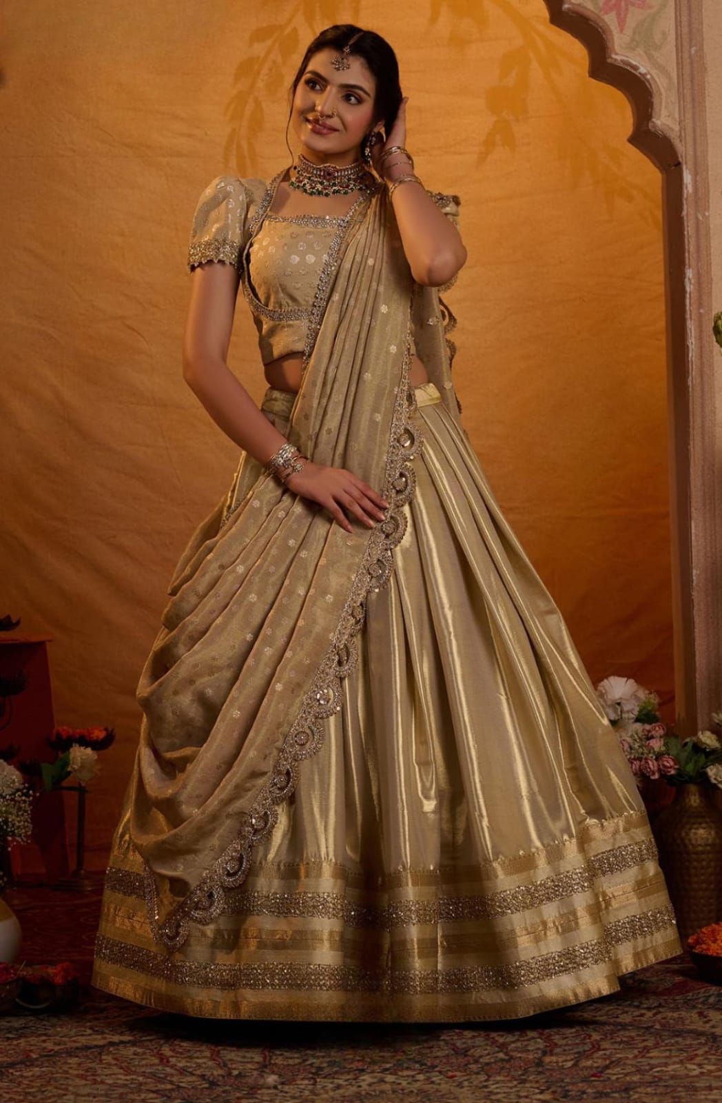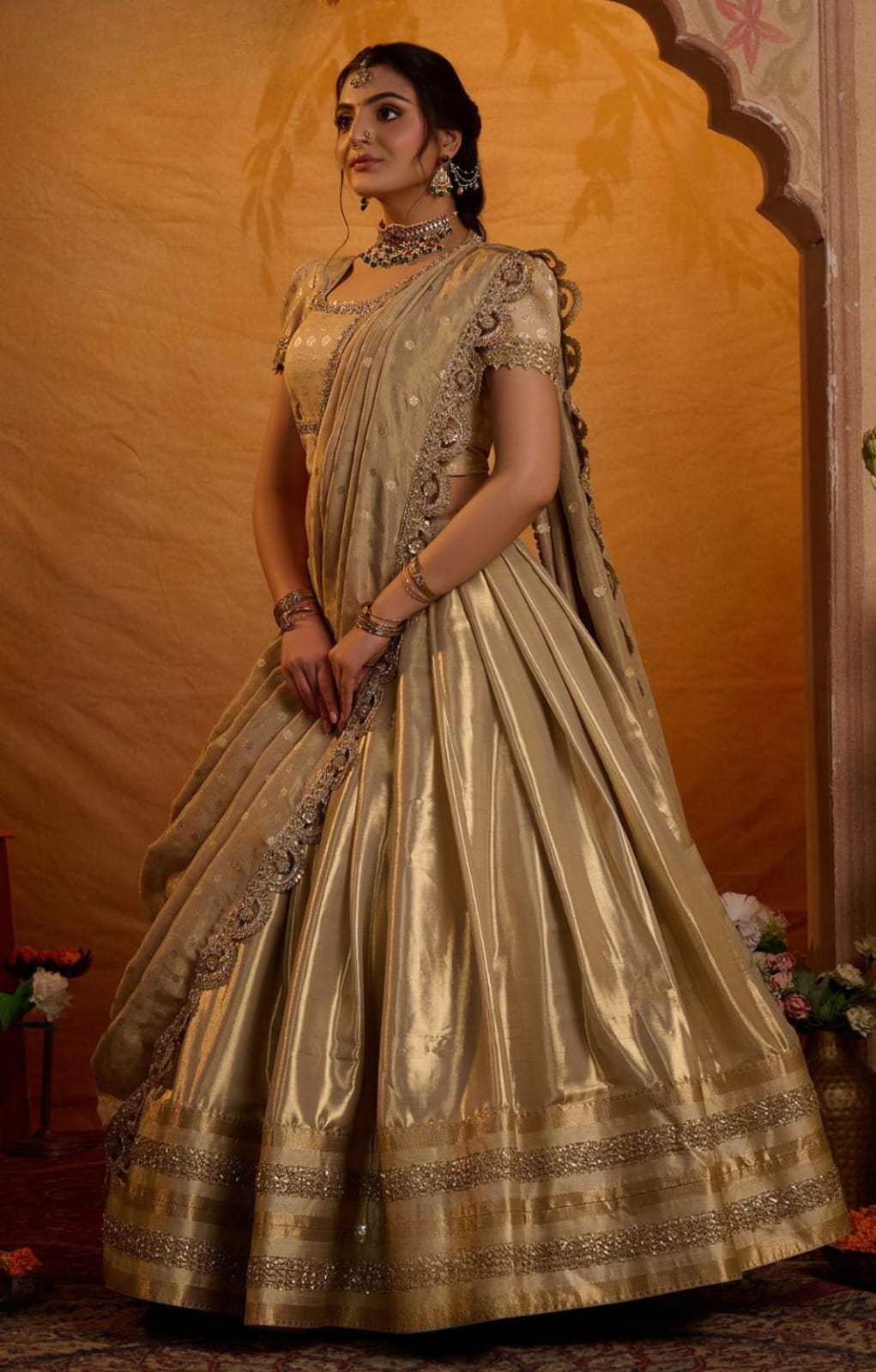 Radiate elegance in this exquisite lehenga, inspired by Aditi Rao Hydari’s wedding look. The voluminous skirt is crafted in luxurious Gadwal Zari Silk, featuring a broad shimmering border with intricate lacework that adds grandeur and richness to the ensemble. The jacquard blouse comes with a graceful Madhubala neckline and classic puff sleeves, detailed with delicate lace embellishments that enhance its royal charm. Paired with a jacquard silk dupatta, adorned with an elegant lace border, the look is completed with an aura of sophistication and timeless beauty. This lehenga beautifully blends heritage craftsmanship with modern elegance, making it perfect for weddings, festive occasions, and grand celebrations.