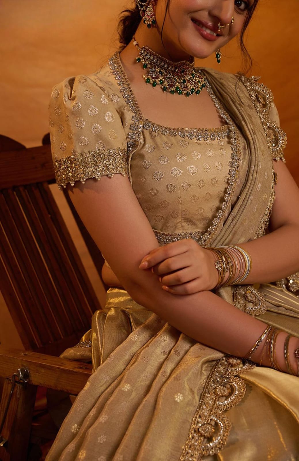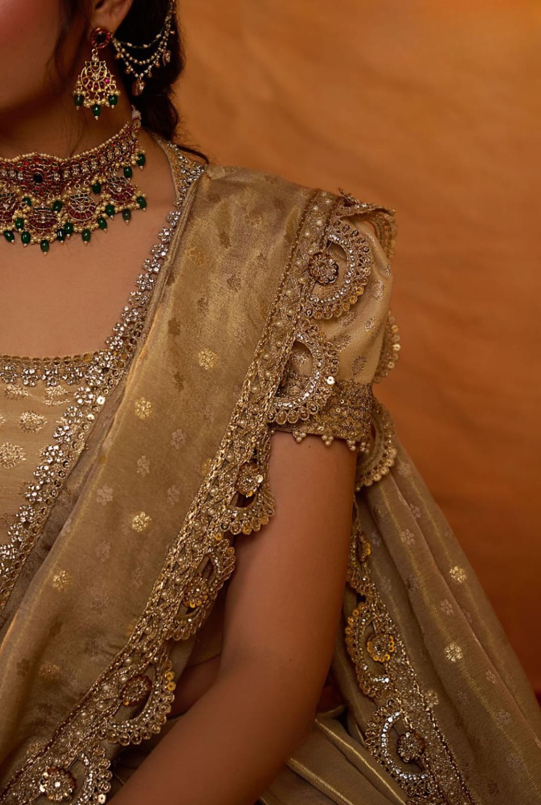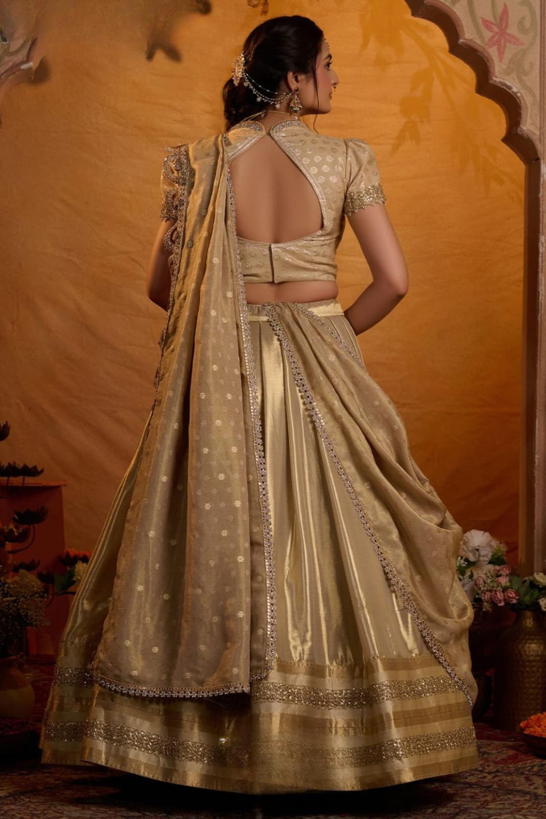 Radiate elegance in this exquisite lehenga, inspired by Aditi Rao Hydari’s wedding look. The voluminous skirt is crafted in luxurious Gadwal Zari Silk, featuring a broad shimmering border with intricate lacework that adds grandeur and richness to the ensemble. The jacquard blouse comes with a graceful Madhubala neckline and classic puff sleeves, detailed with delicate lace embellishments that enhance its royal charm. Paired with a jacquard silk dupatta, adorned with an elegant lace border, the look is completed with an aura of sophistication and timeless beauty. This lehenga beautifully blends heritage craftsmanship with modern elegance, making it perfect for weddings, festive occasions, and grand celebrations.