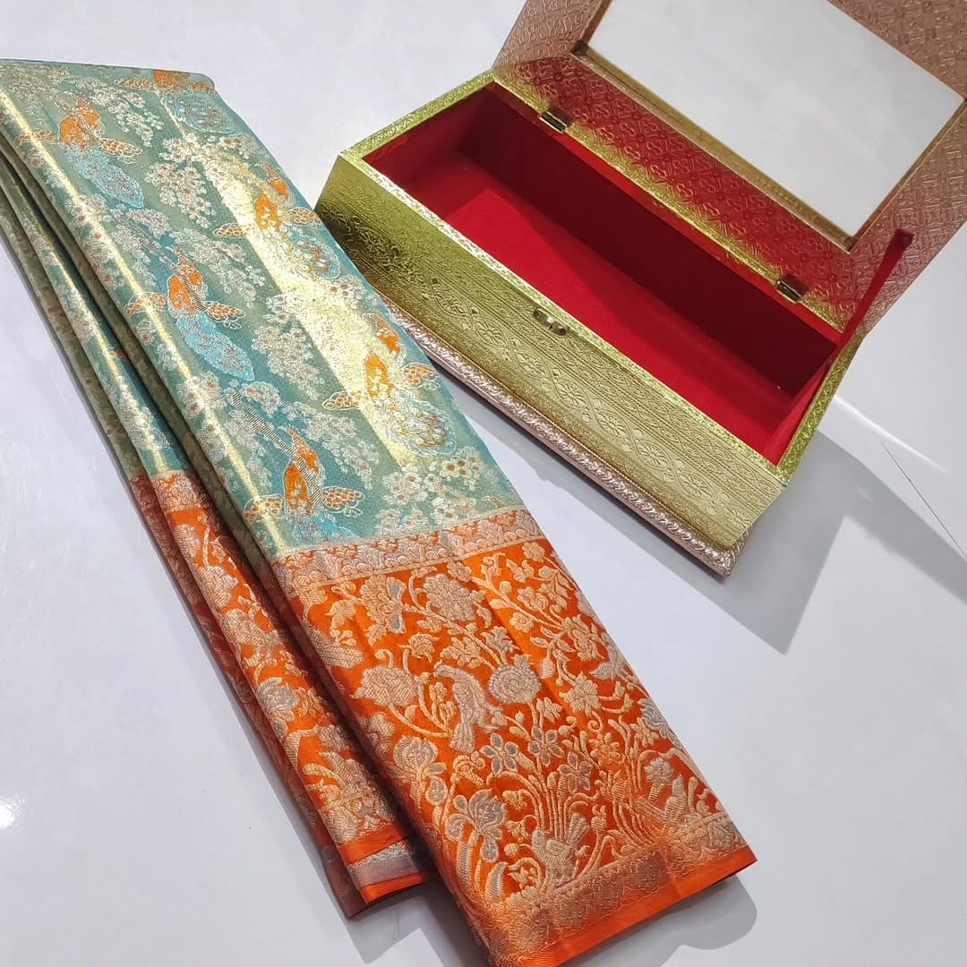 Trendy shade pure kanchipuram tissue edge to edge 1g meenakari designs