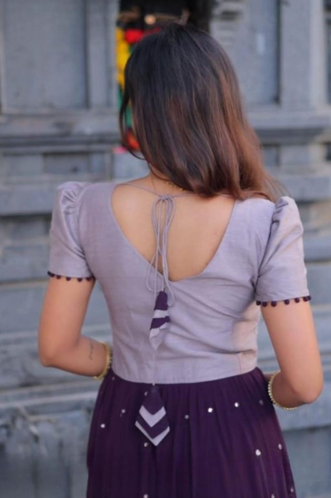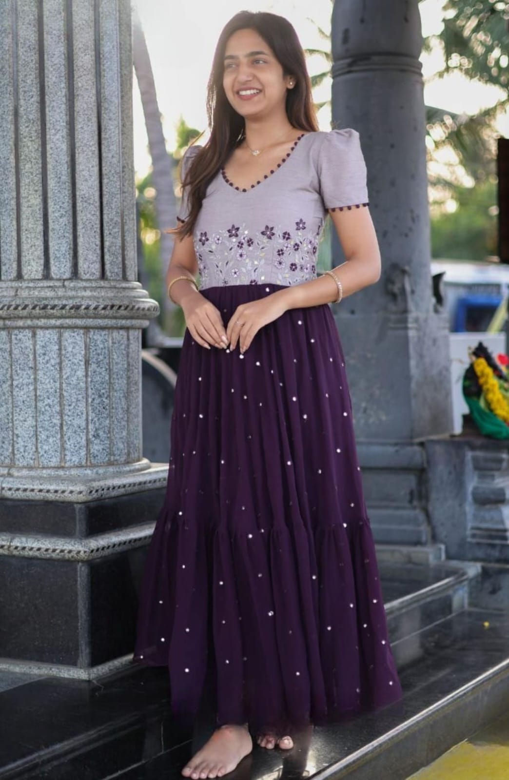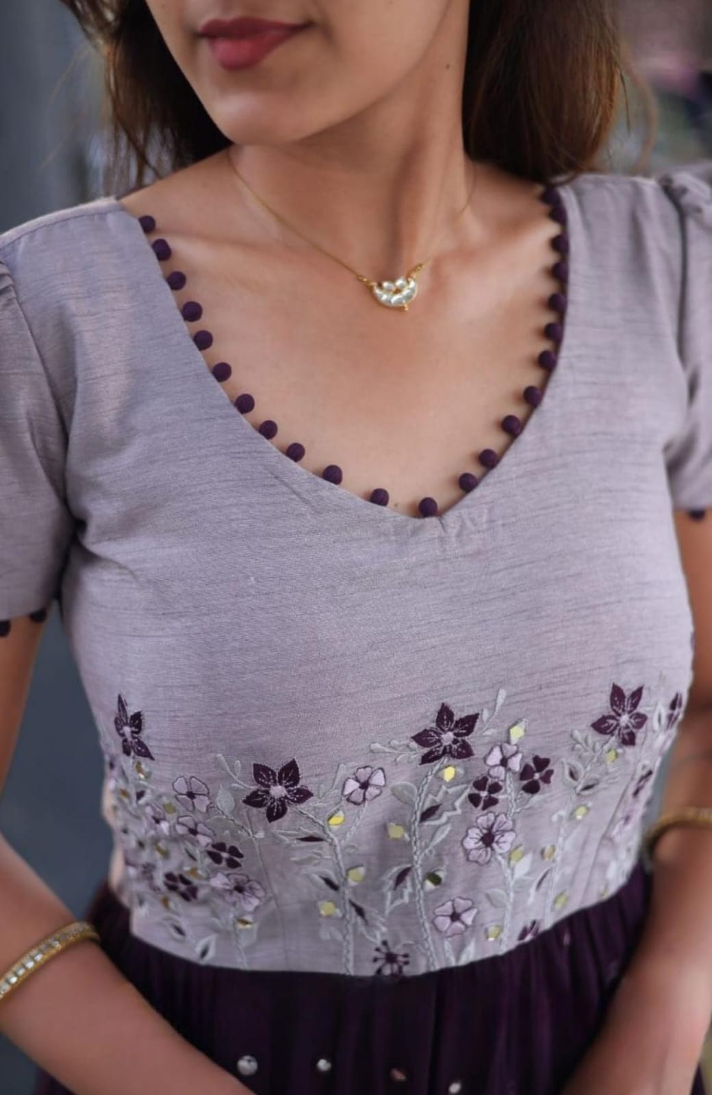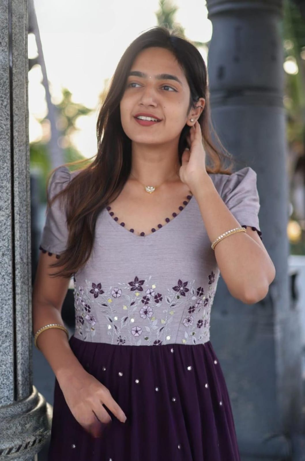 The Srinika long dress, crafted from a luxurious blend of silk and georgette in a rich wine hue, is a stunning choice for various occasions. The dress showcases intricate floral embroidery on the yoke, complemented by fabric potli buttons at the V-neckline and on the sleeves. The elegant flare of the dress is beautifully enhanced with delicate mirrorwork scattered across the fabric. This dress is ideal for traditional events, family gatherings, festivals, or temple visits, offering a refined yet understated look. Pair it with minimal jewelry to complete your ensemble.