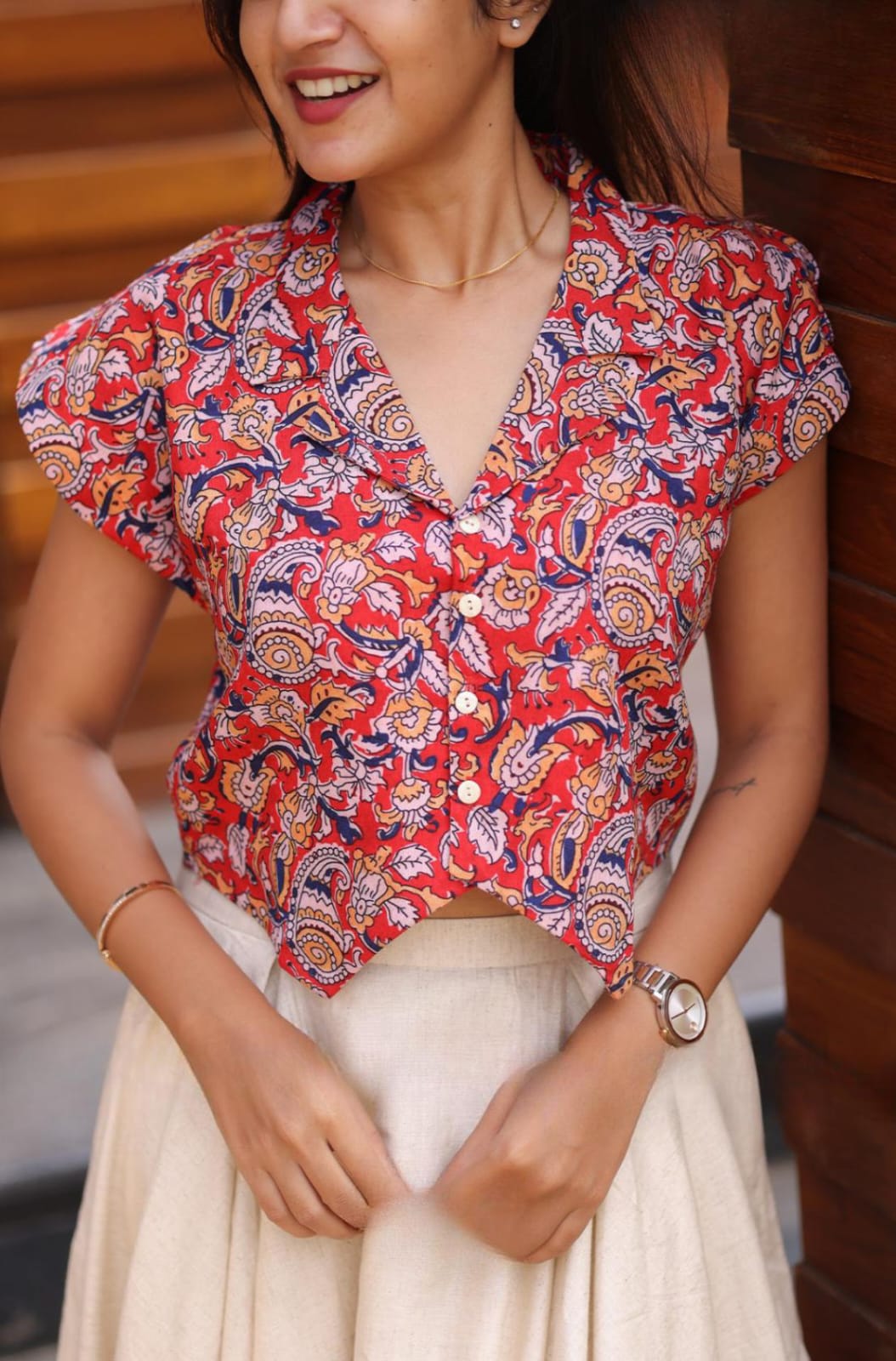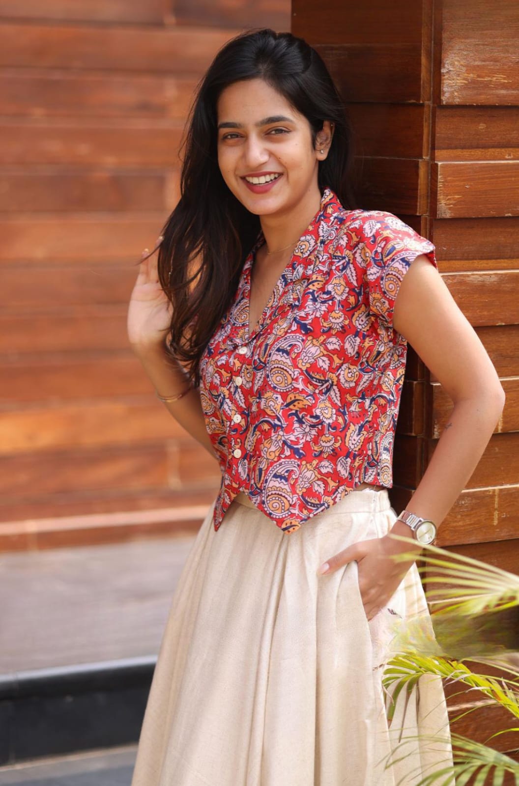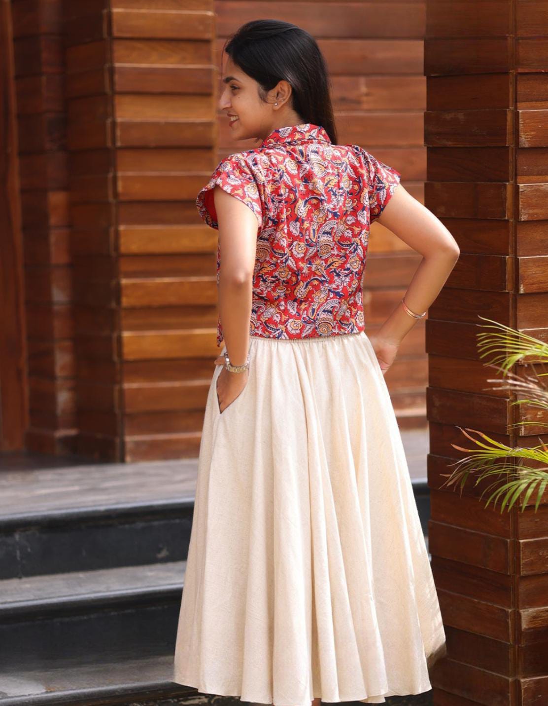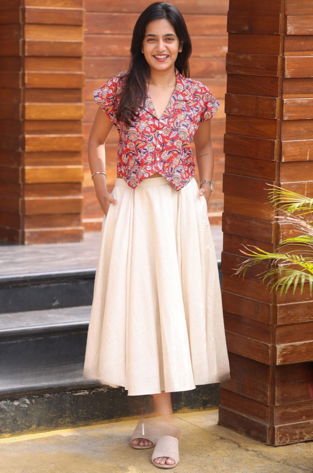 Wear Our beautiful Stella Co-ord set to your work, wear it to lunch, wear it just because it’s not an outfit it is a beauty that you own. This Co-ord set comes with V-neckline classic collar Kalamkari shirt is a semi-scalloped style with cape sleeves and a shell button that enhances the overall look. The box pleated pocket silhouettes of the skirt make sure to move with you not against you with bold and solid beige colour it will best at any place. This Stella Co-ord set is perfect when you pair it with comfy sandals and minimal accessories for a casual yet classy look.