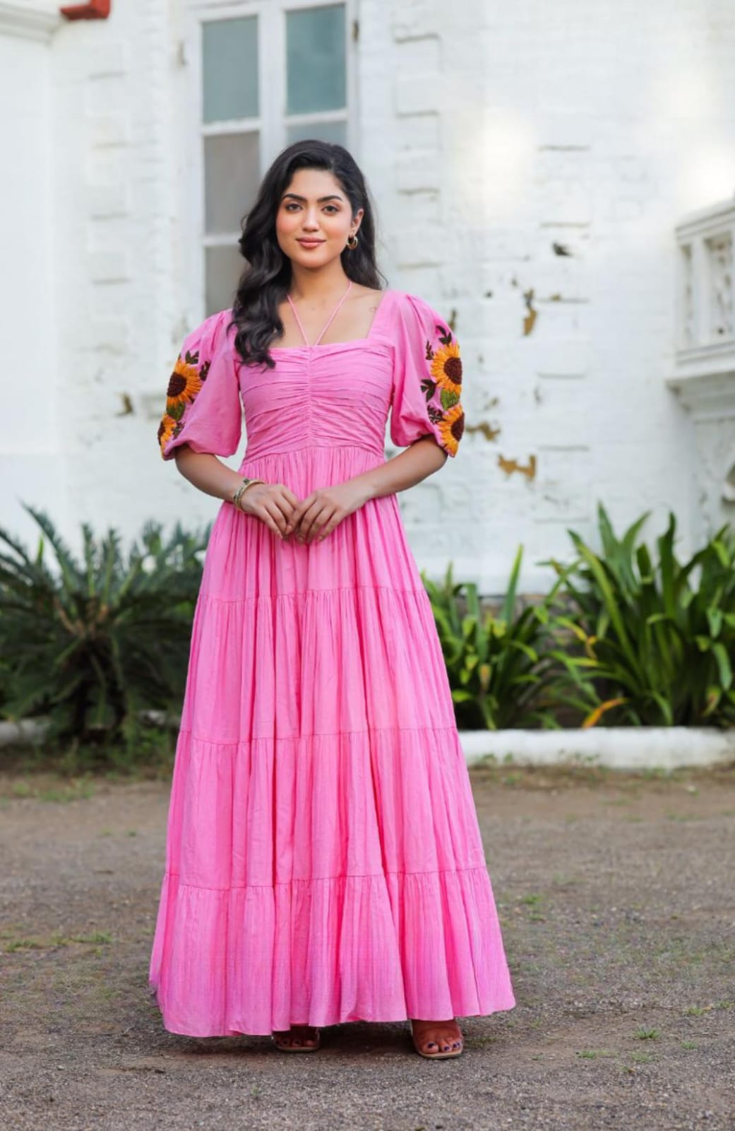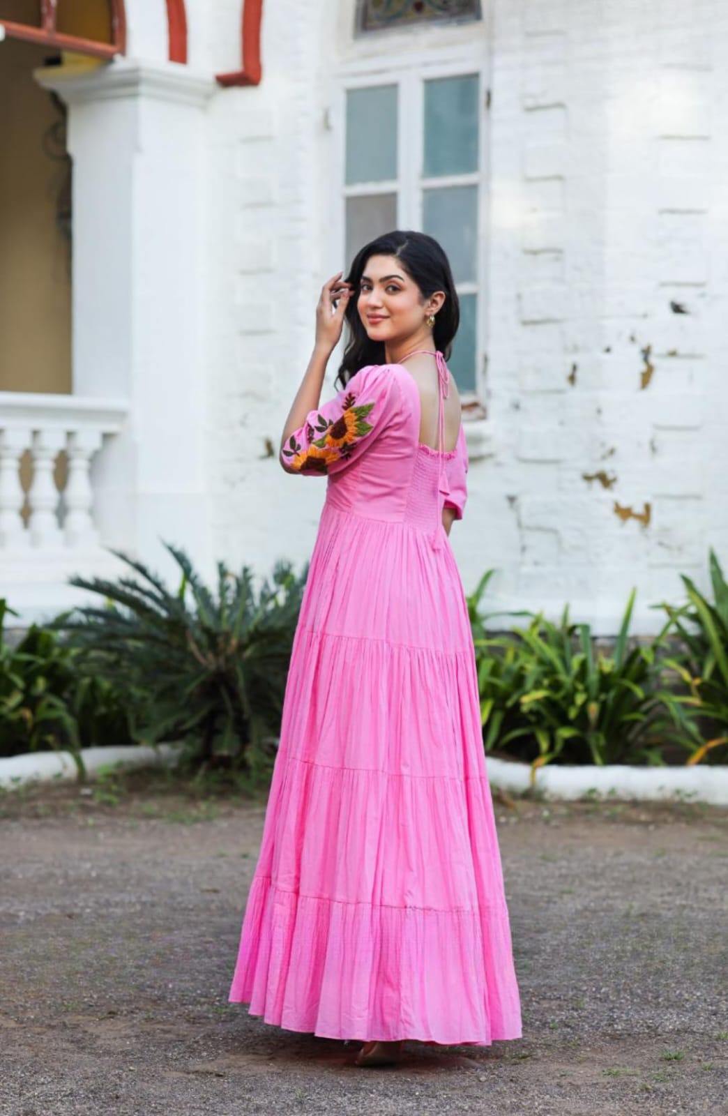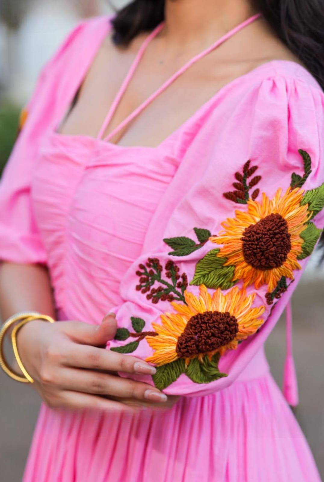Presenting a sunflower bliss dress, the perfect resort wear to add to your wardrobe. This long, flowing pink dress features a fitted bodice and puffed sleeves featuring sunflower handwork. The dress has a tiered design, adding a soft and elegant texture. This resort wear creates a charming look yet a stylish vibe, which is best for daytime events, garden parties, or vacation moods. (Side Zip Attached)