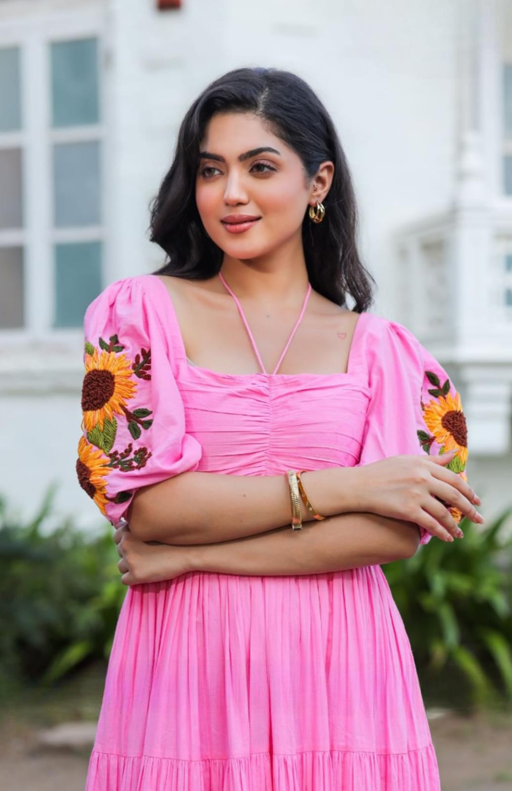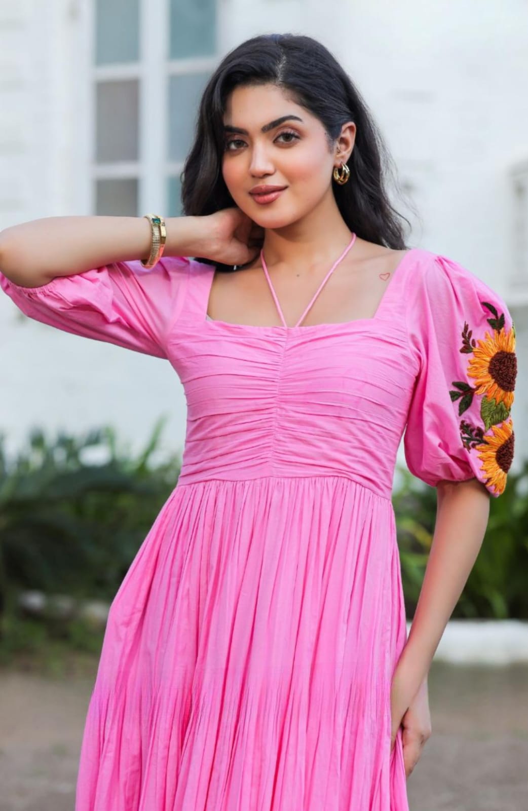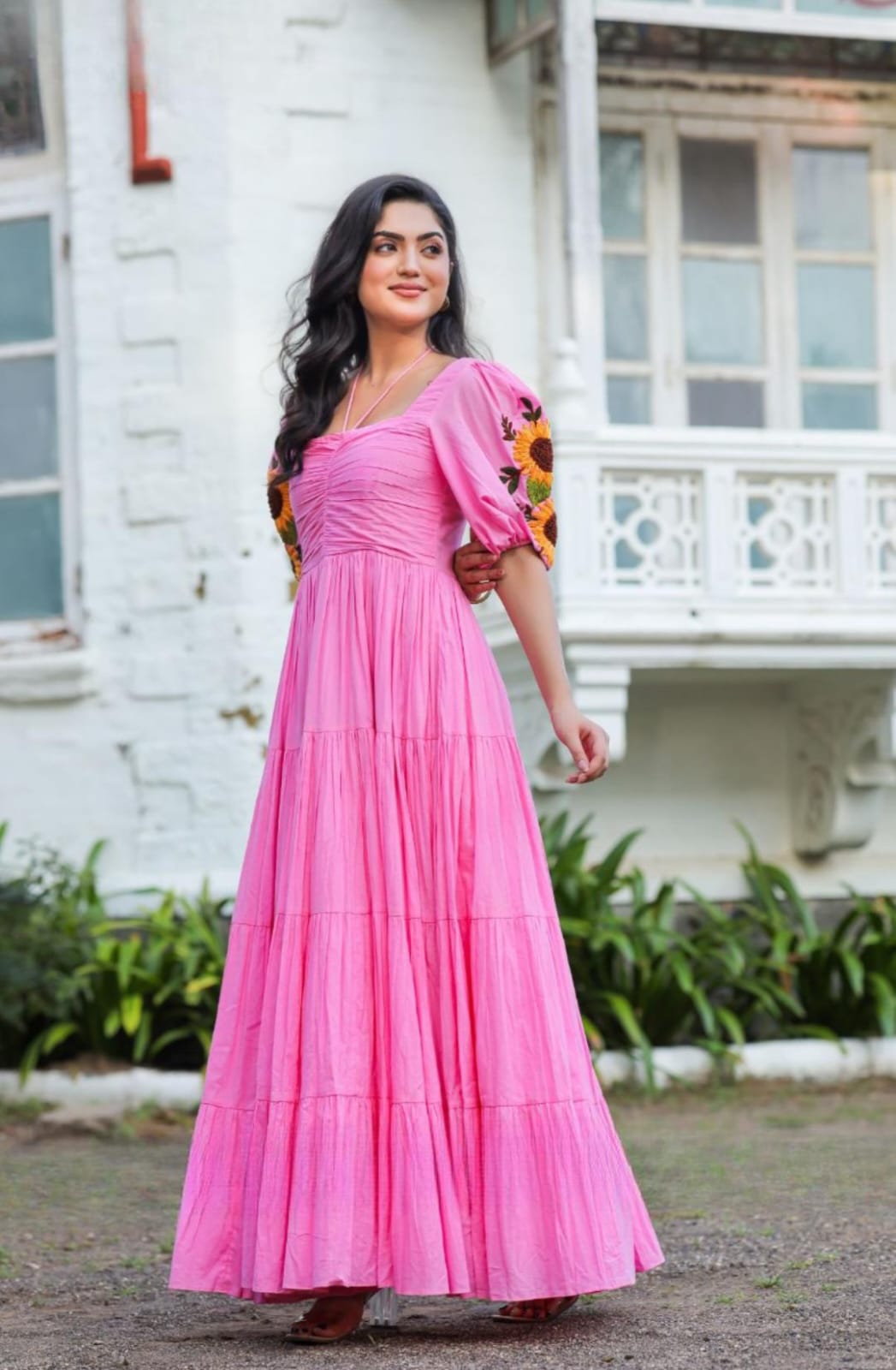 Presenting a sunflower bliss dress, the perfect resort wear to add to your wardrobe. This long, flowing pink dress features a fitted bodice and puffed sleeves featuring sunflower handwork. The dress has a tiered design, adding a soft and elegant texture. This resort wear creates a charming look yet a stylish vibe, which is best for daytime events, garden parties, or vacation moods. (Side Zip Attached)