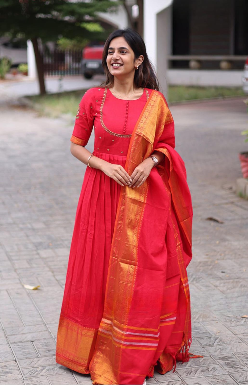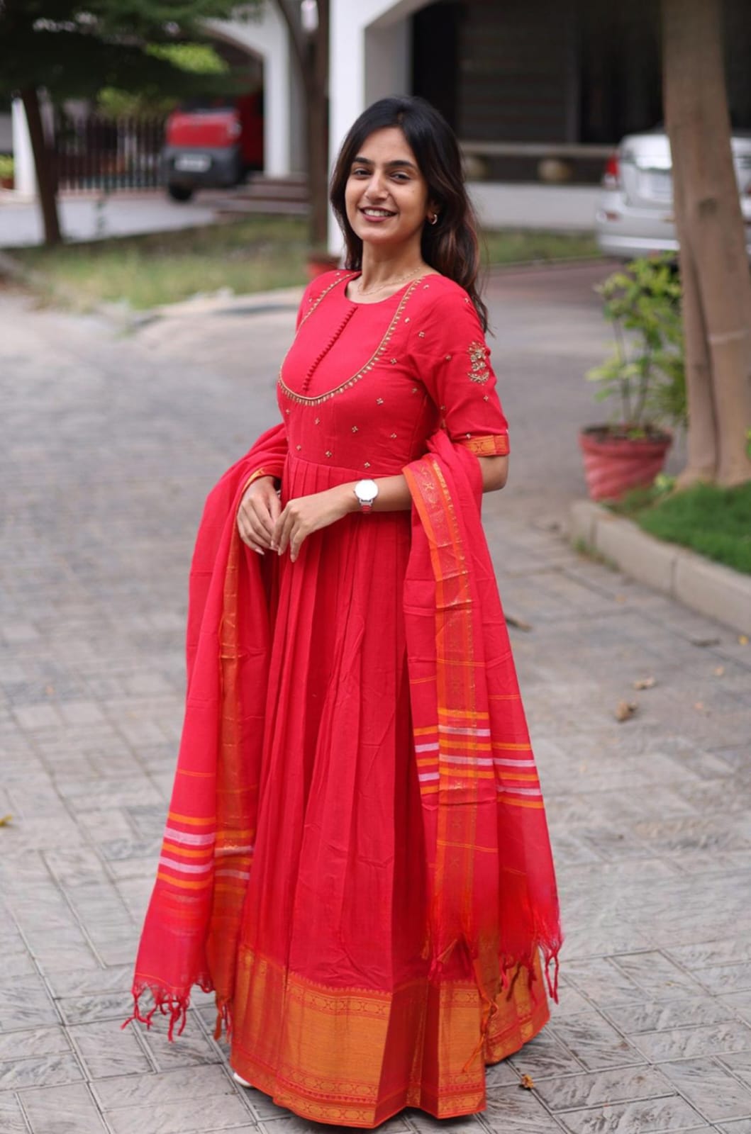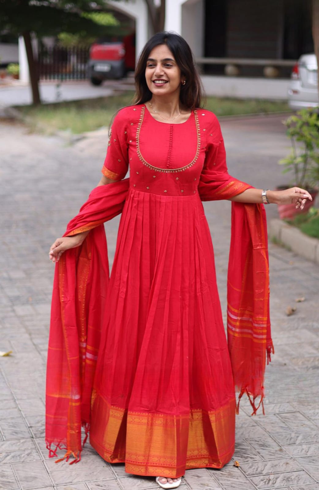 Presenting the beauty of craftsmanship with a modern touch of this Sutrangi Anarkali Dress in red color that is perfect for everything you are looking for. The Anarkali dress has a simple round neckline and handwork on the yoke part as well as sleeves, making the Anarkali dress more elegant. It features a floor-length with a golden thread weaving border and knife pleats that gather for comfort. The same handloom dupatta will enhance the overall look of the attire. Go for simple and traditional jewellery that will be perfect for this outfit and simple flats for superior relaxation.