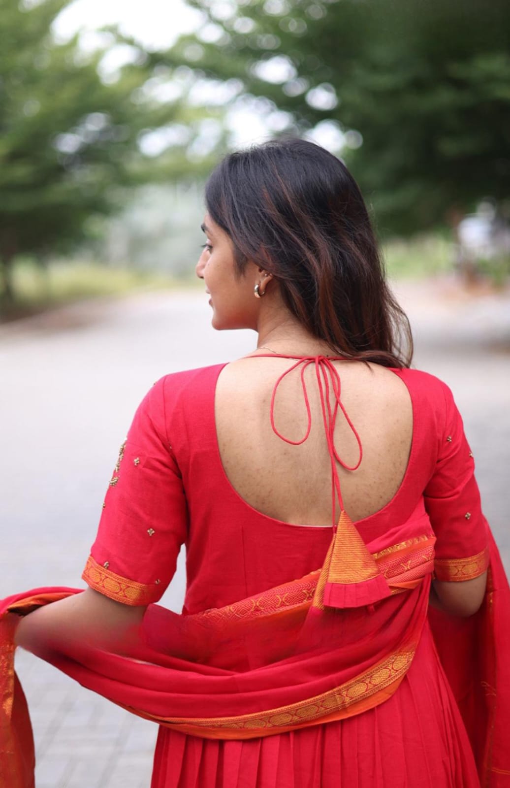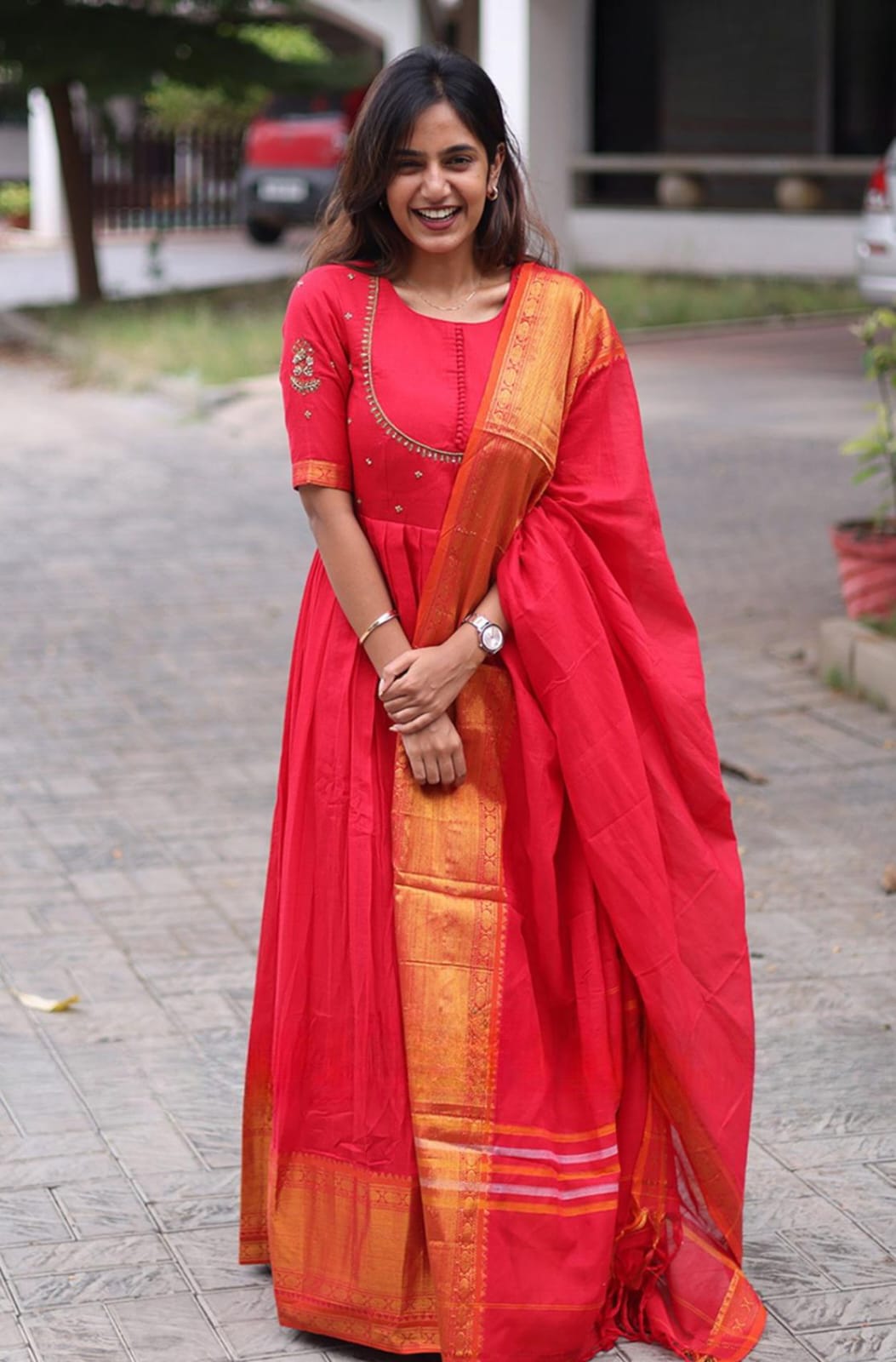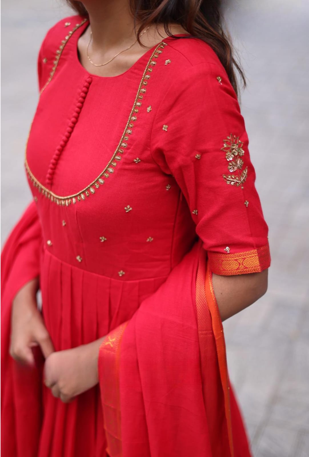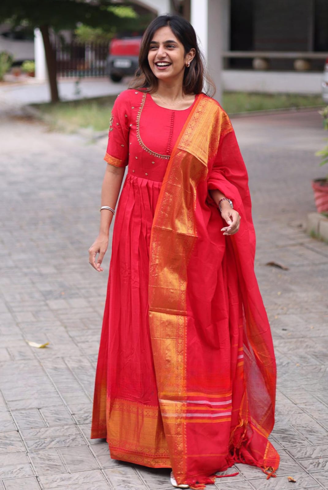 Presenting the beauty of craftsmanship with a modern touch of this Sutrangi Anarkali Dress in red color that is perfect for everything you are looking for. The Anarkali dress has a simple round neckline and handwork on the yoke part as well as sleeves, making the Anarkali dress more elegant. It features a floor-length with a golden thread weaving border and knife pleats that gather for comfort. The same handloom dupatta will enhance the overall look of the attire. Go for simple and traditional jewellery that will be perfect for this outfit and simple flats for superior relaxation.