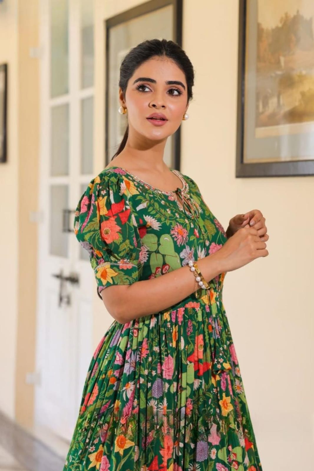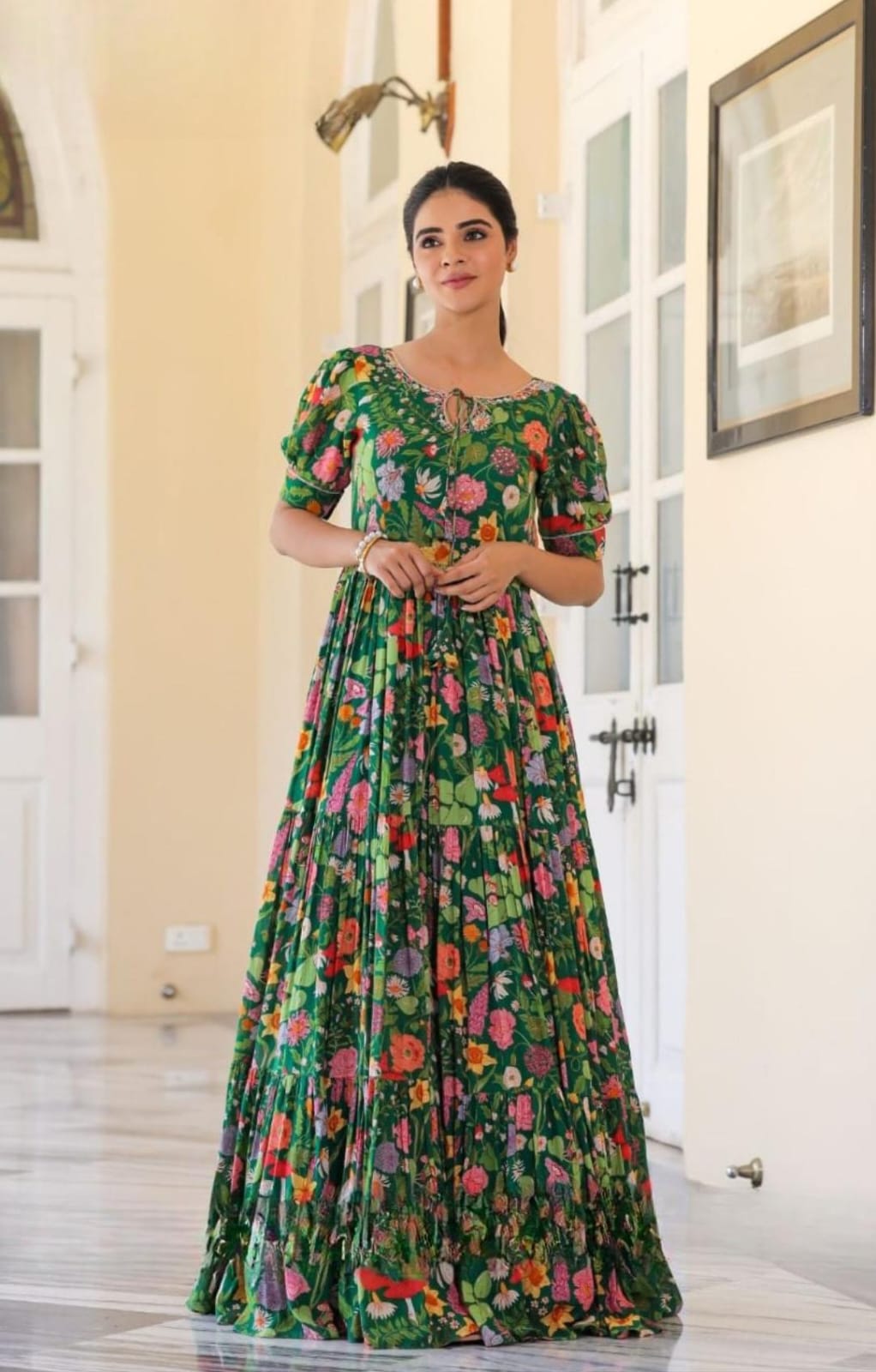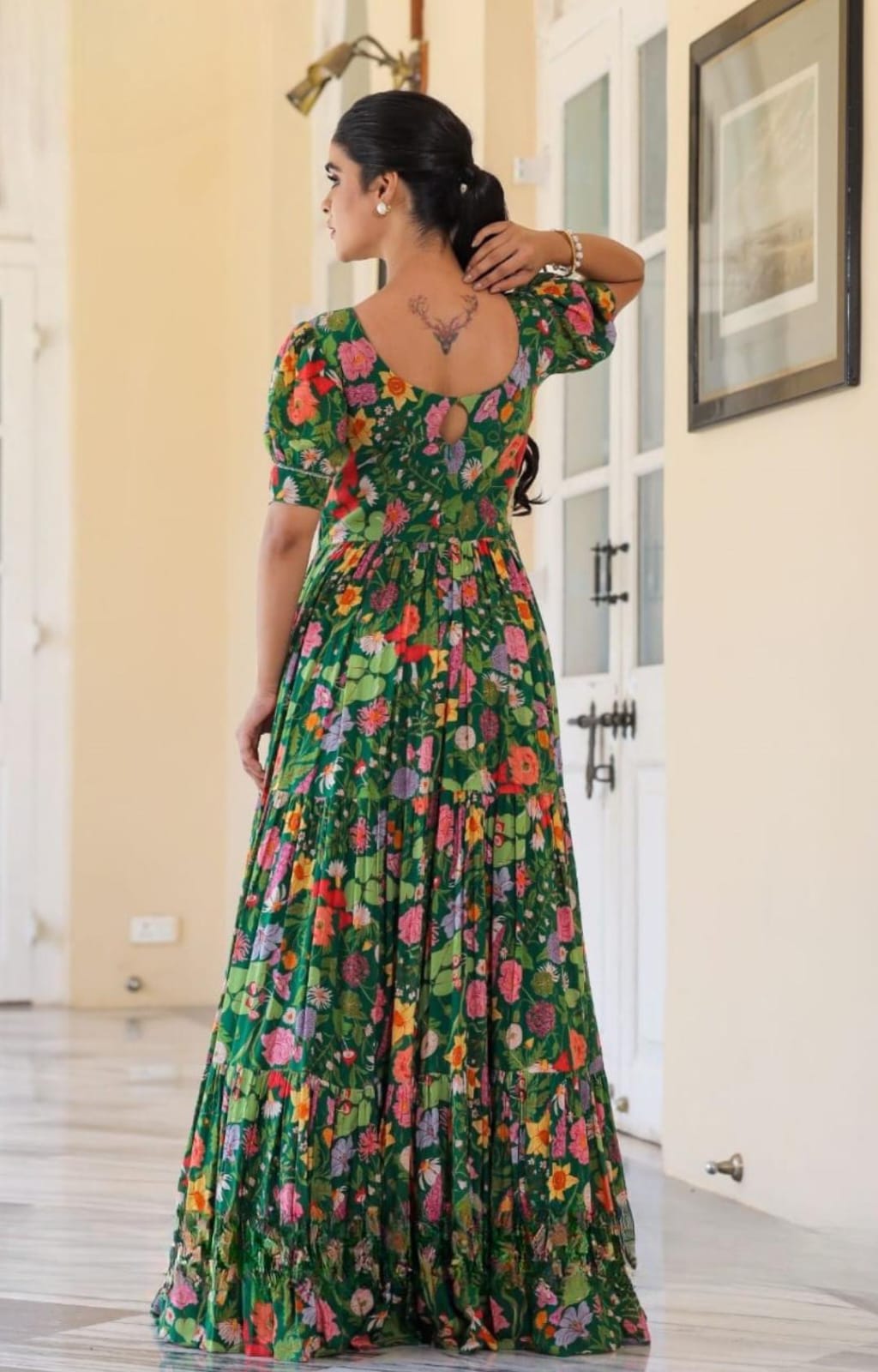 Are you looking for style and comfort? Try this beautiful Titli long dress, which is gorgeous and features a vibrant floral print reflecting a lively, fresh appeal. With a rich green base, the fabric is adorned with colorful blooms in shades of pink, purple, orange, and yellow, creating a cheerful, nature-inspired pattern. The dress has puffed and flattering sleeves, offering a perfect balance of relaxed charm and vibrant energy. This dress will make you feel effortless. The full, flowing skirt adds movement and grace, making it ideal for a breezy, sun-filled day. (Back Side zip in The Dress)