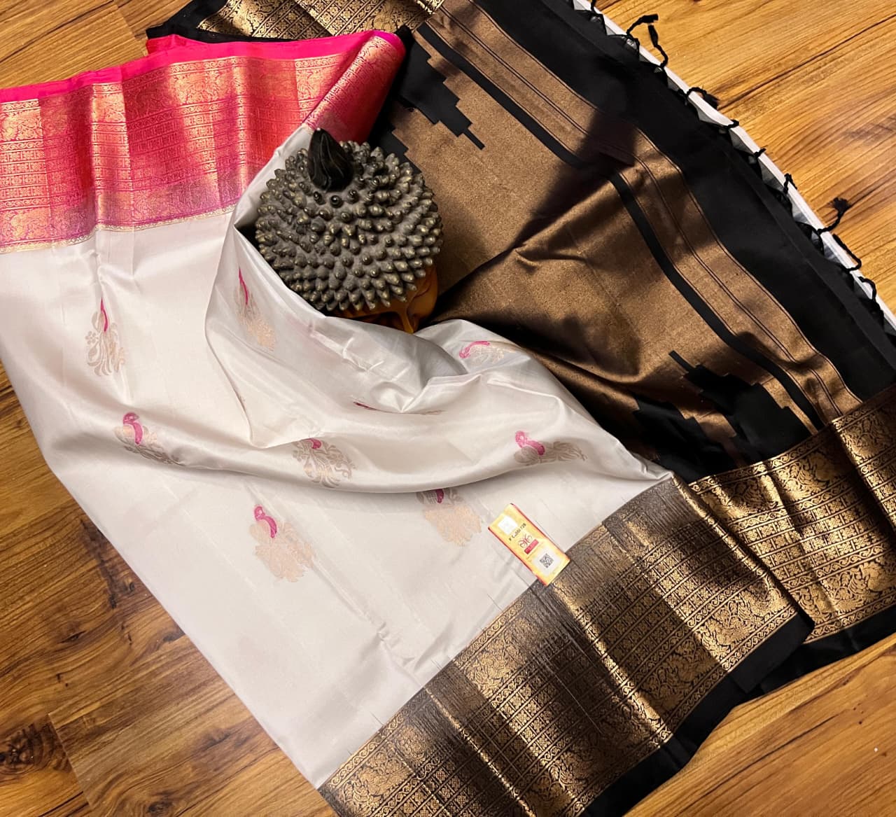 Traditional elegant Kanchipuram pure silk saree *Unique Rich sober colour combo* Pure Kanchipuram silk Handloom weaving Jaquard Border Concept Fancy jarie Border both sides with contrast colour Lightweight 100% Handloom weaving Pure silk by silk Silk mark certified pure silk sarees Jarie butta weaving All over sarees Meena works on butta weaving Contrast Traditional Rich pallu Contrast blouse