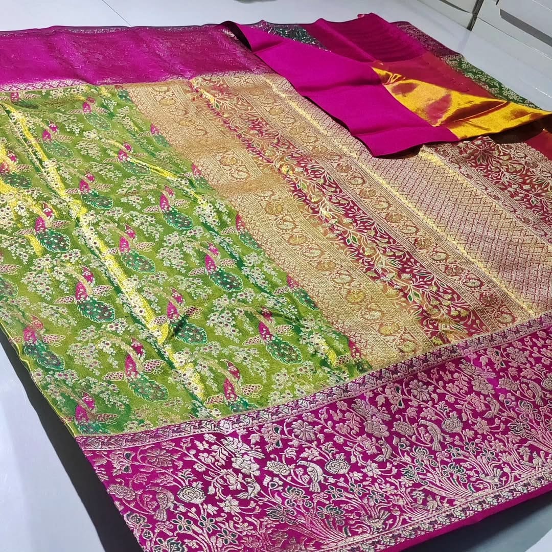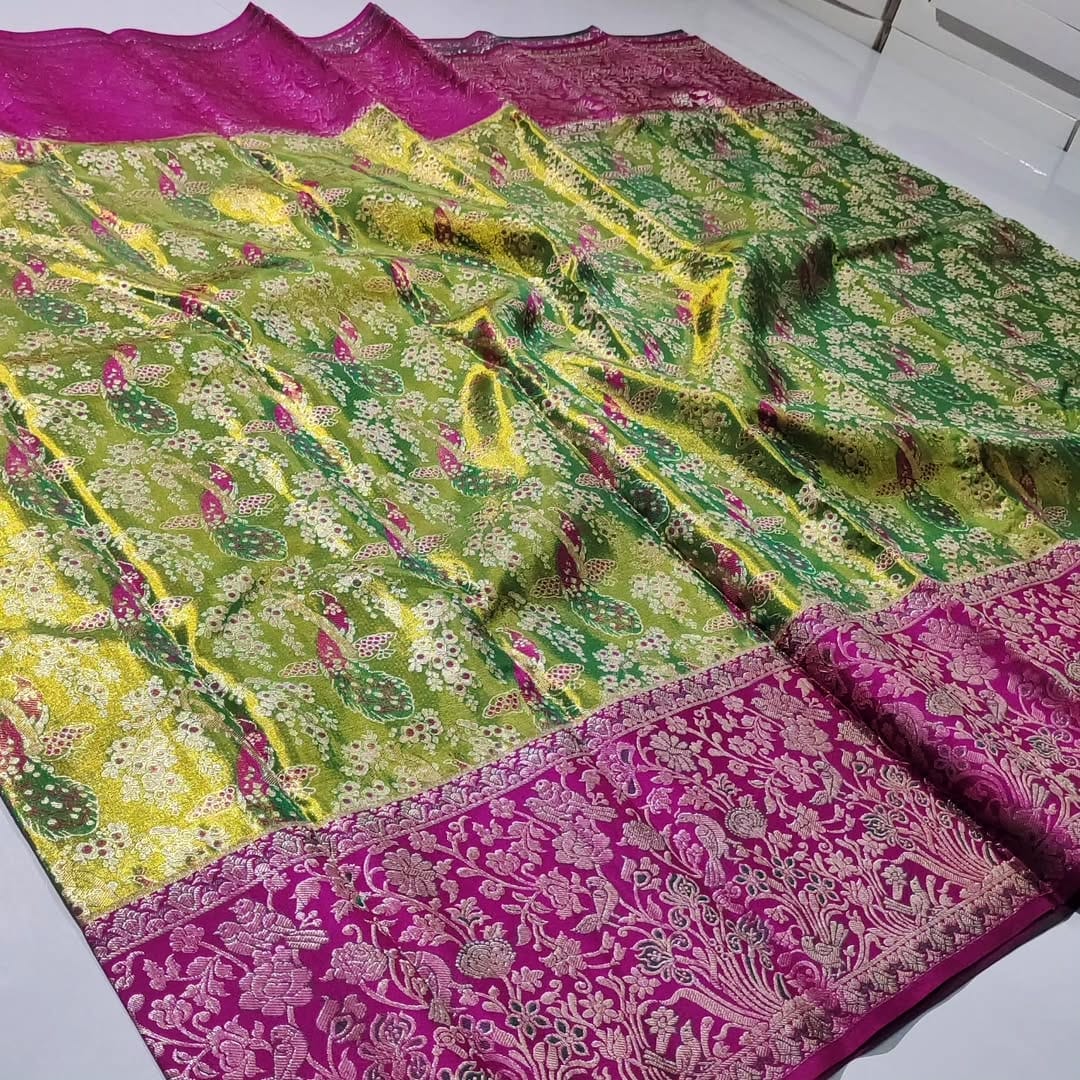 Trendy collection pure kanchipattu tissue resham warp border with 1g meenakari brocade designs