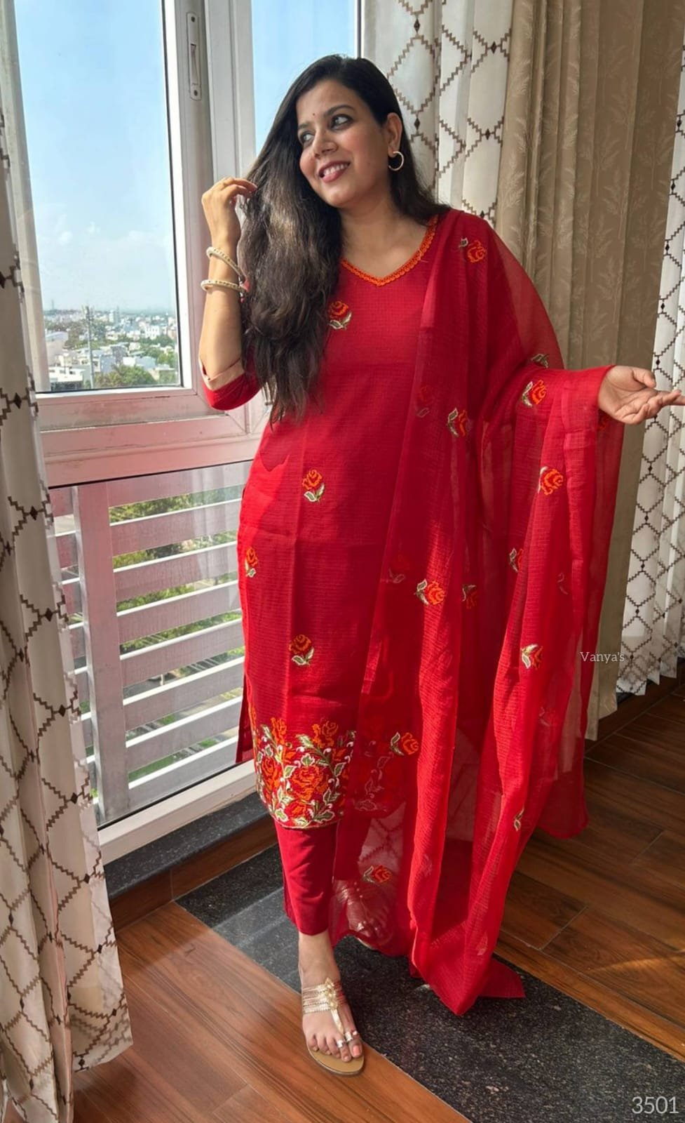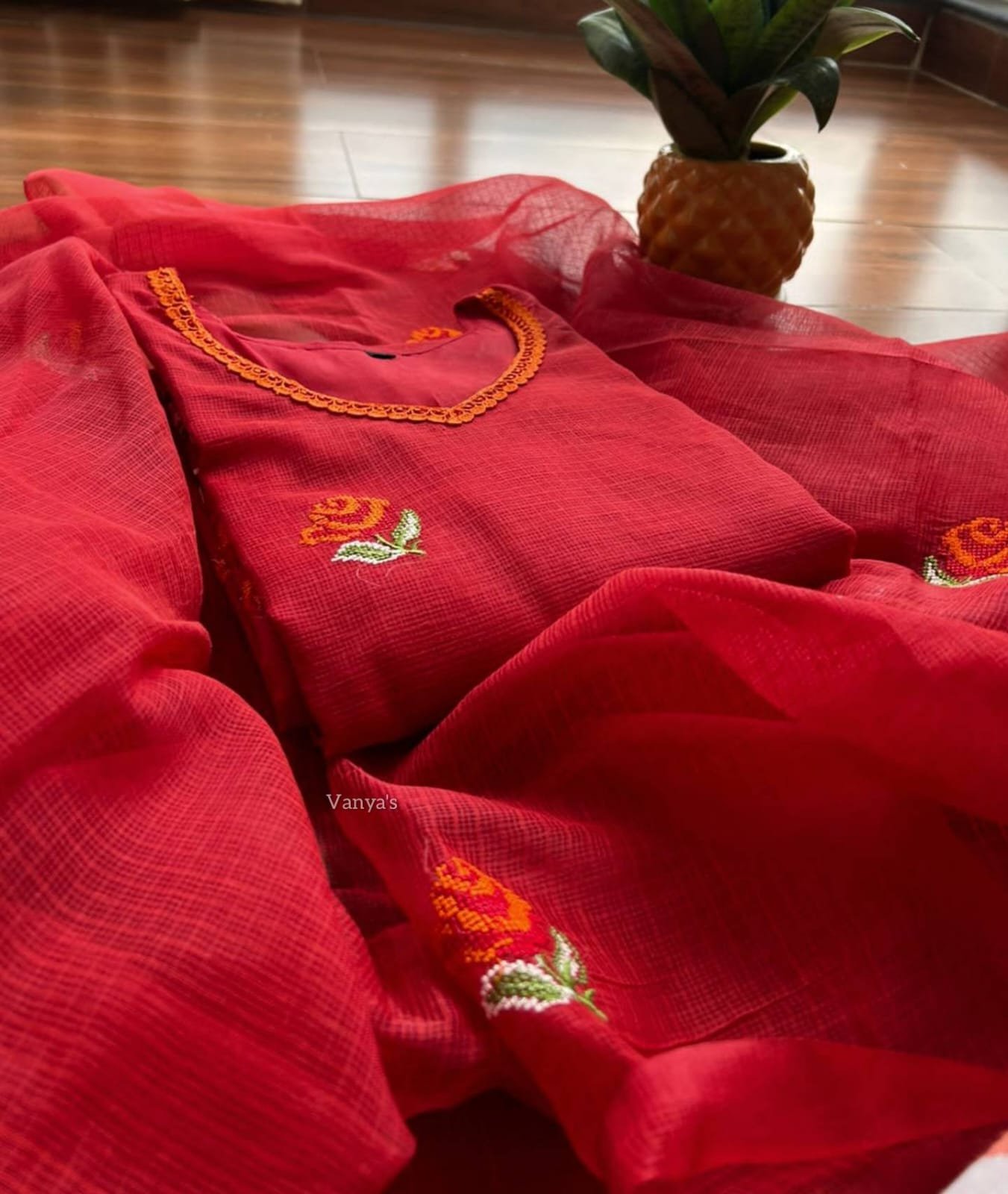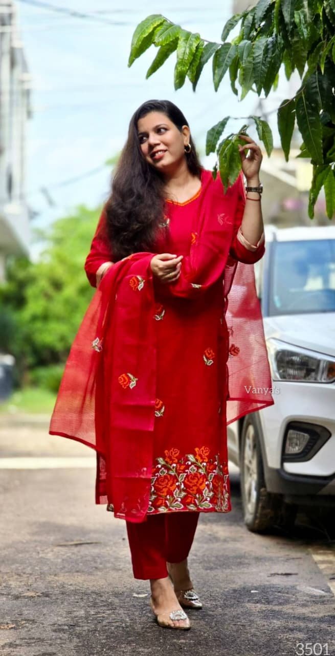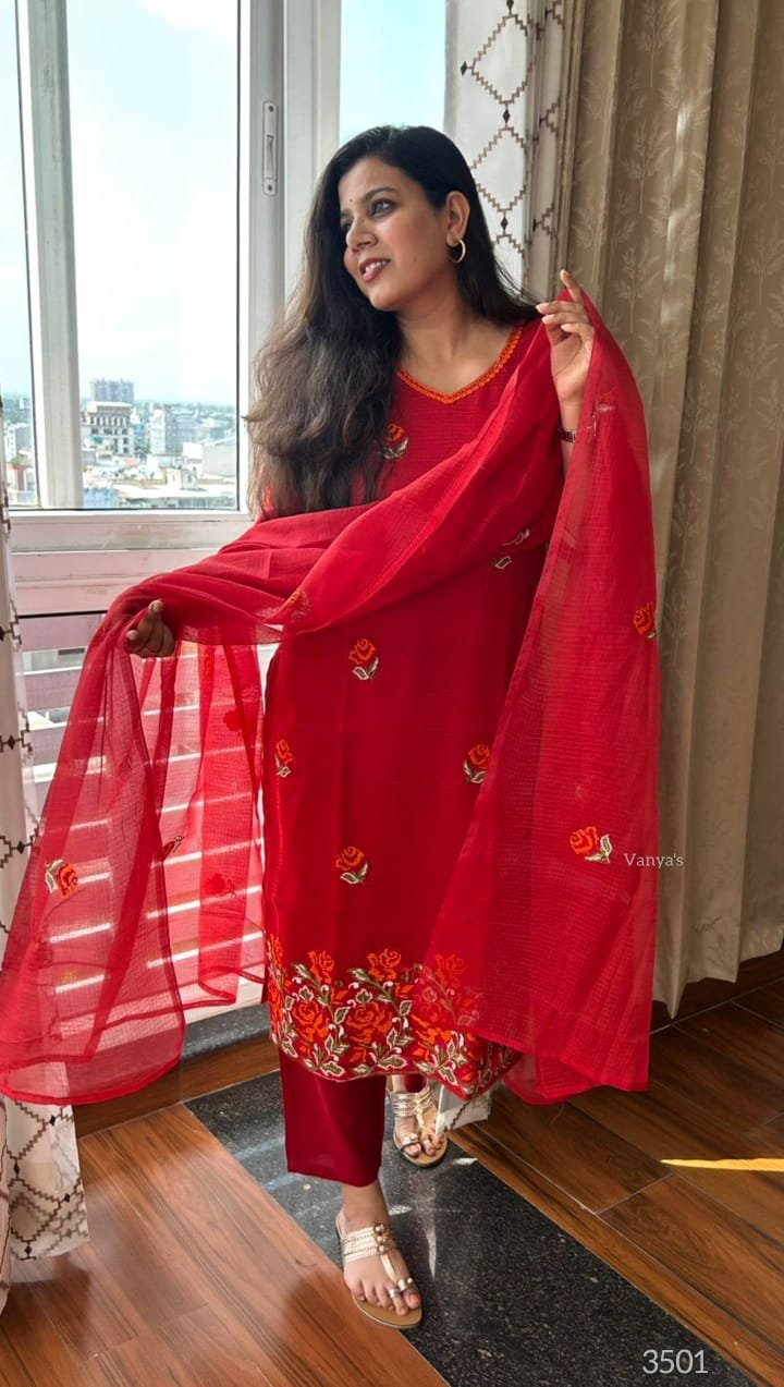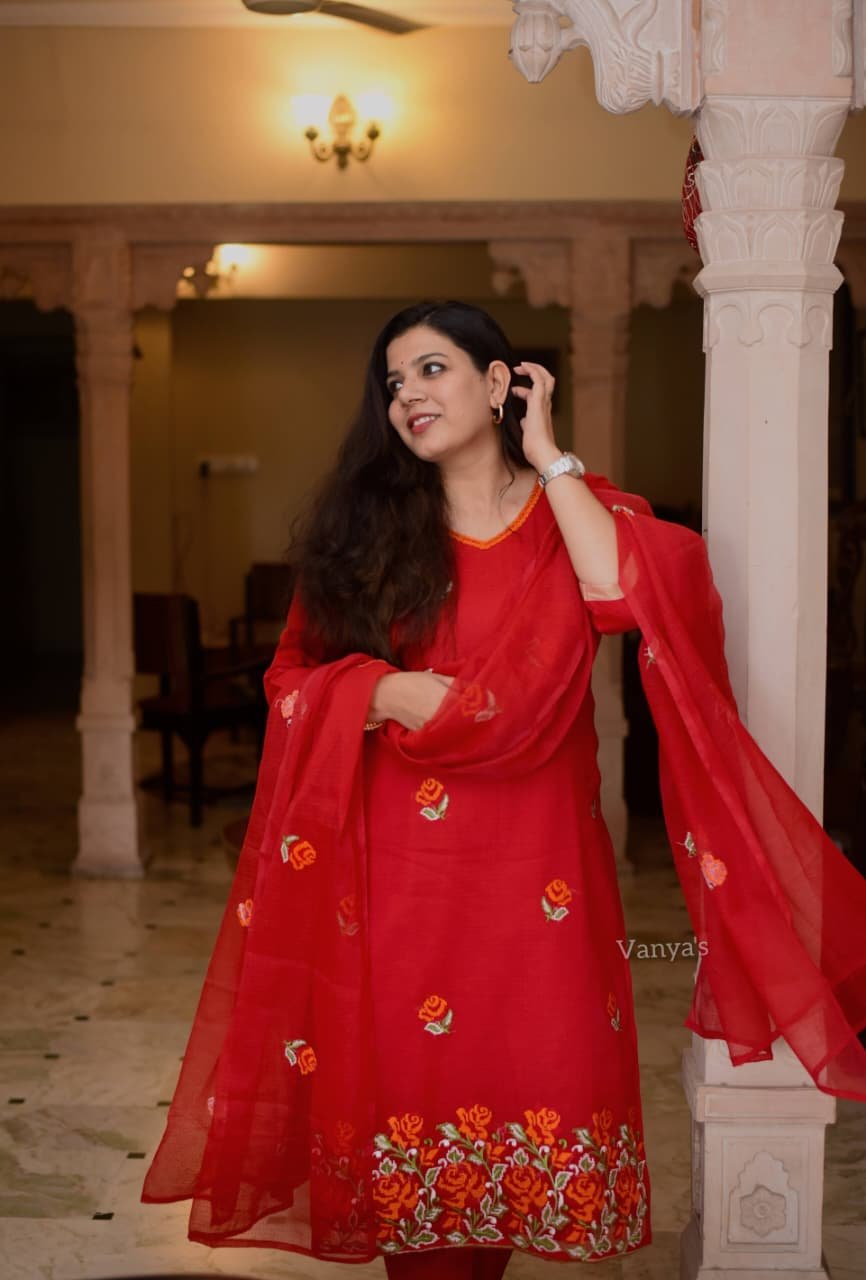 Pure Kota Doria Embroidery Red Kurti Set