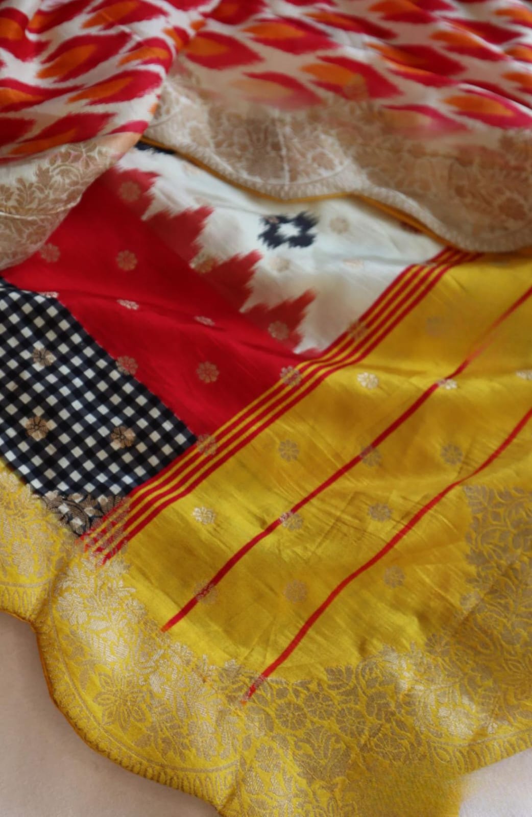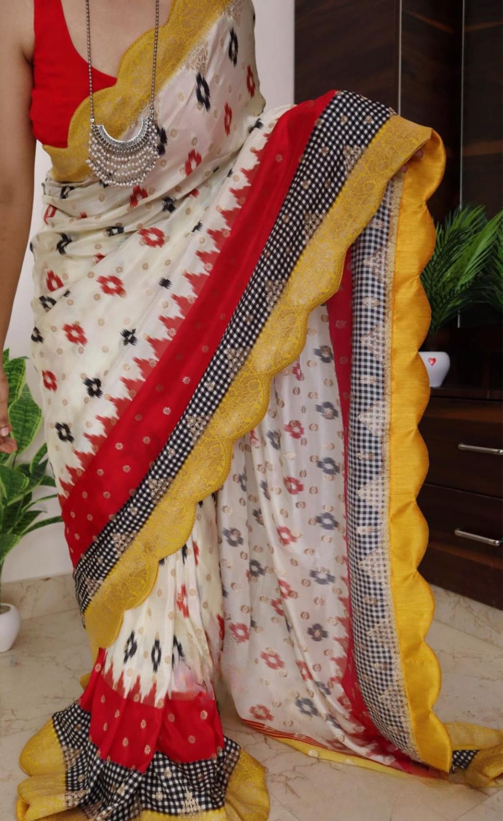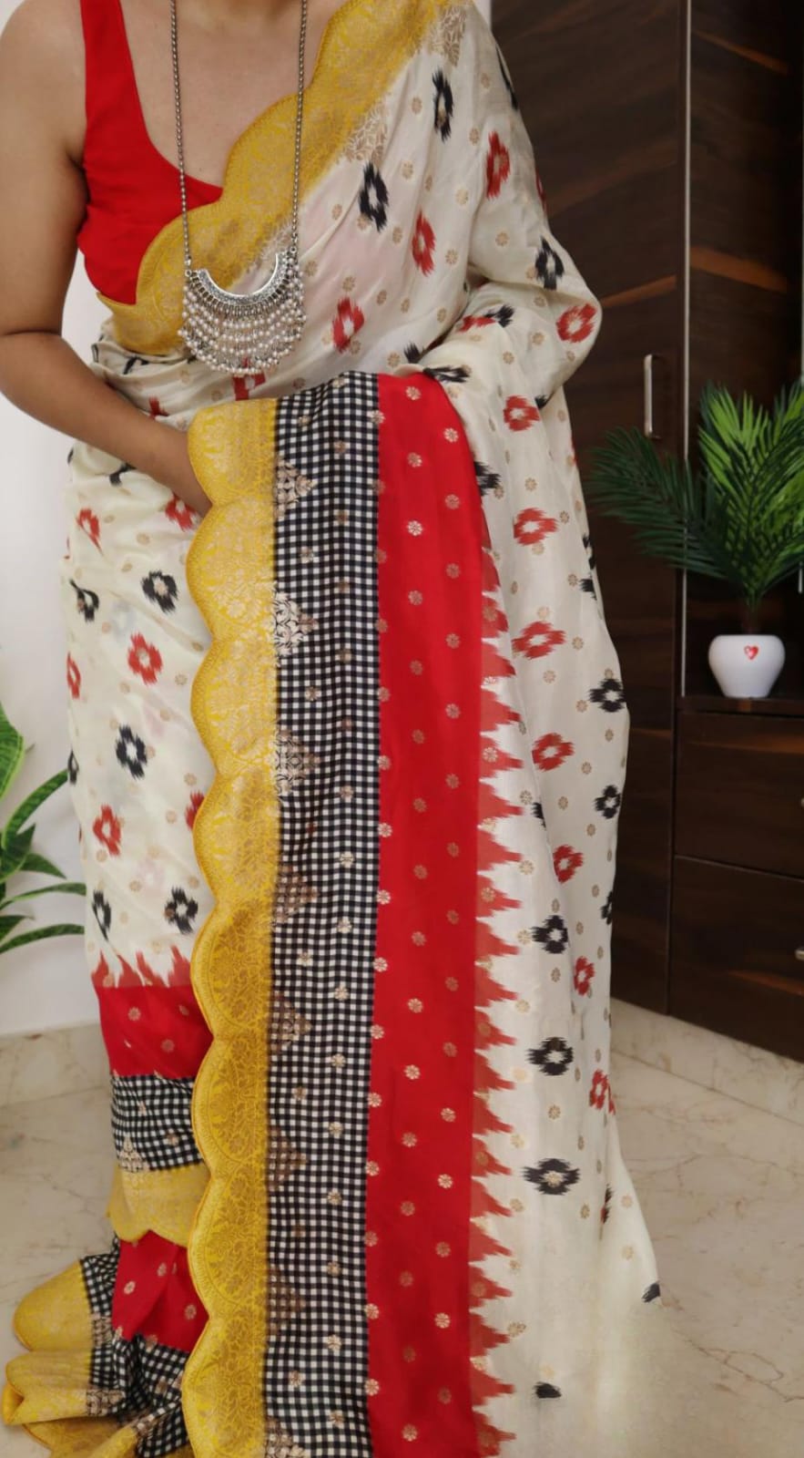 with a scalloped border, featuring a unique look adorned with tiny floral buttas all over