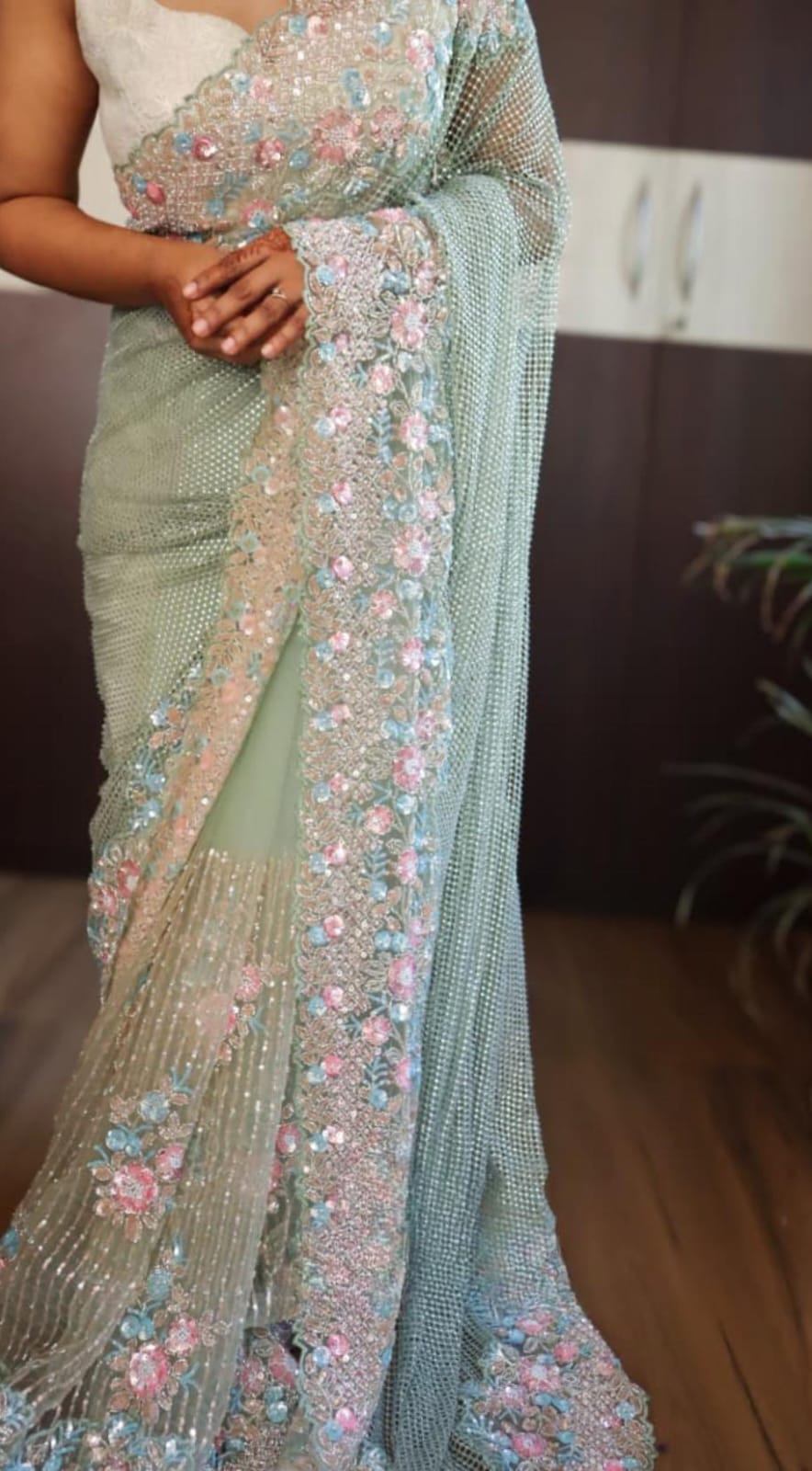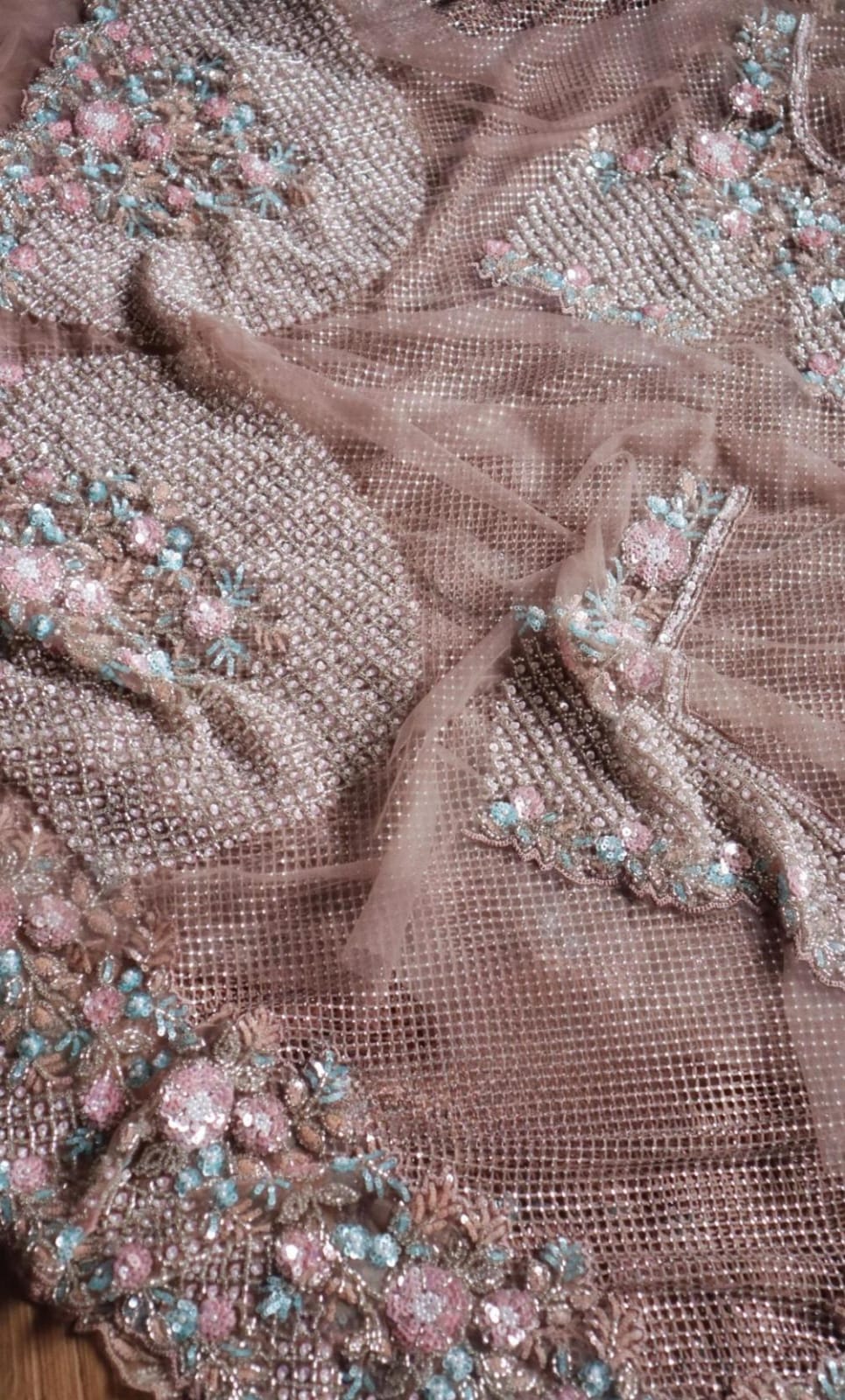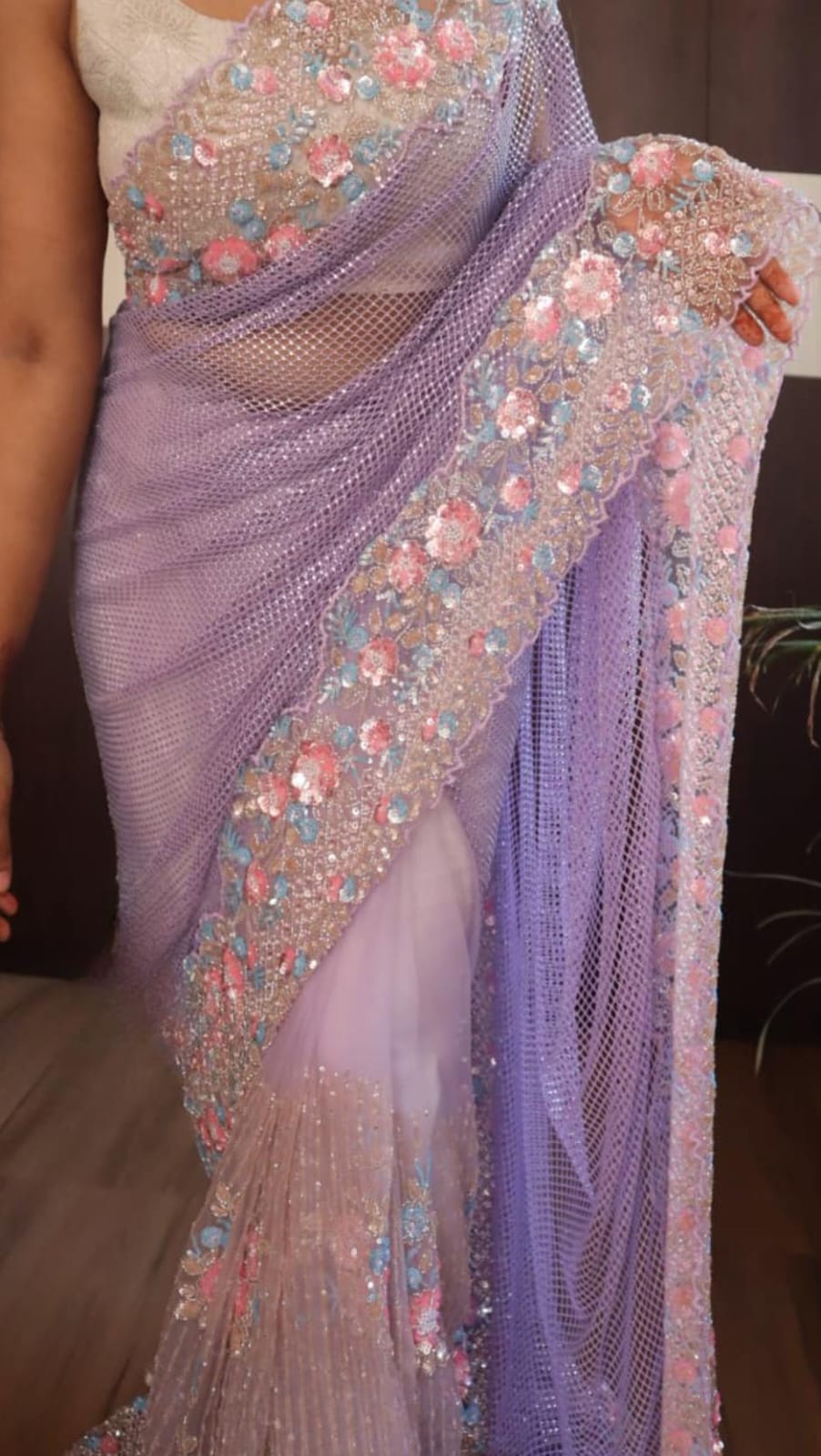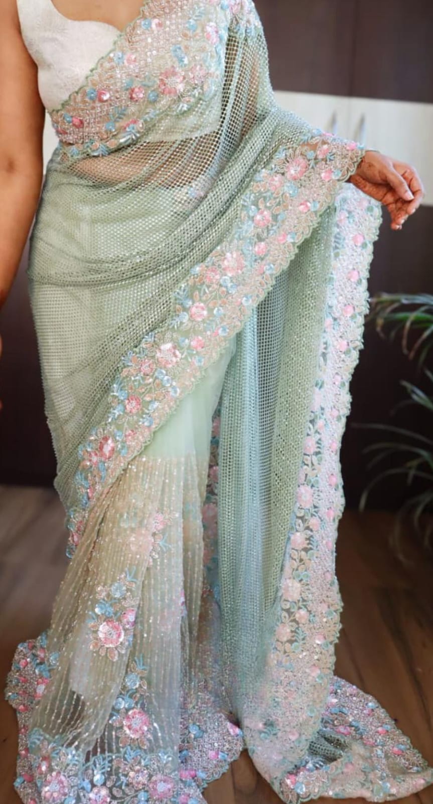 From the delicate shimmer of the mesh pallu to the intricate bursts of pink, aqua, and peach blooms, this drape is made for the woman who walks in elegance and leaves behind a little sparkle.