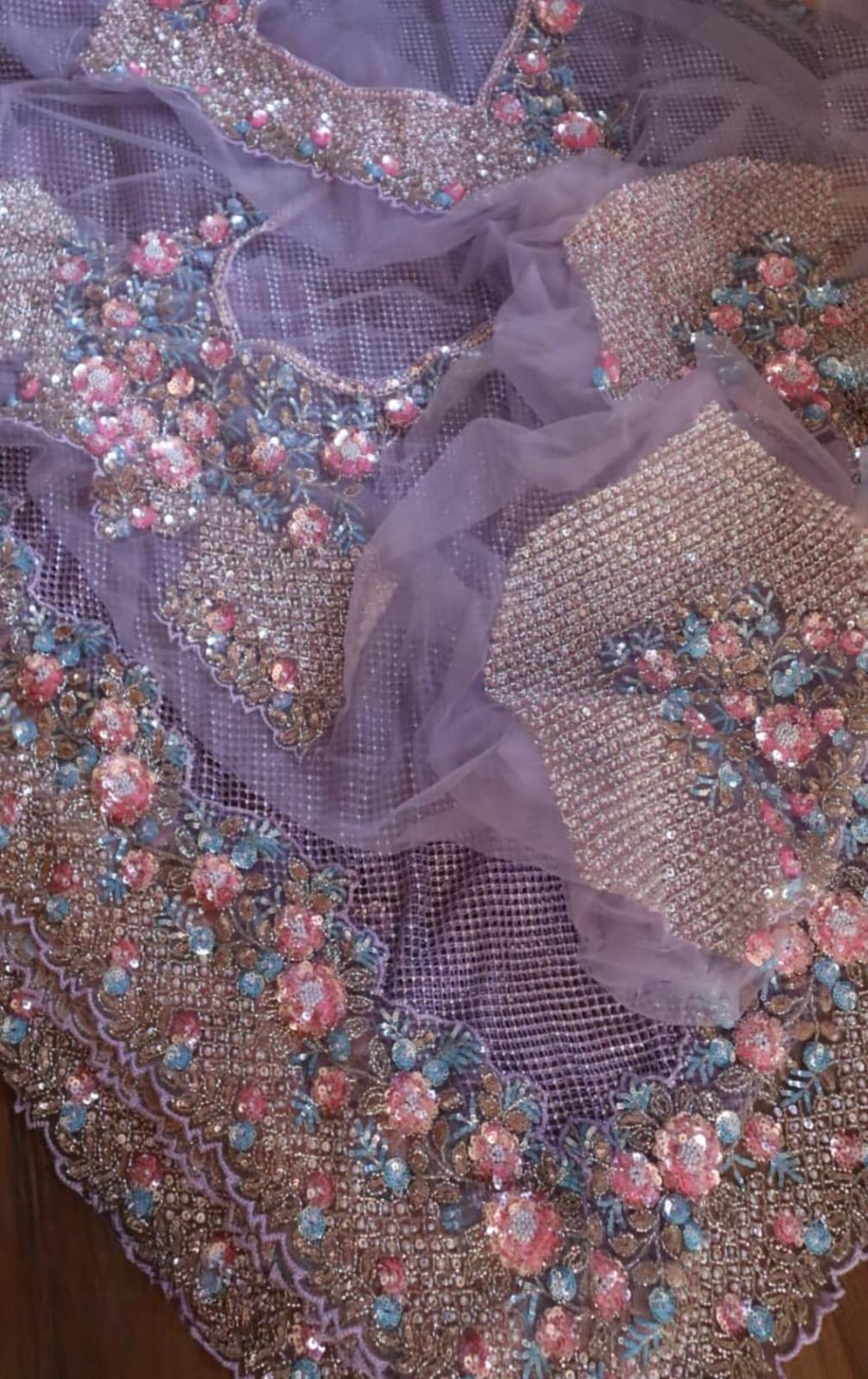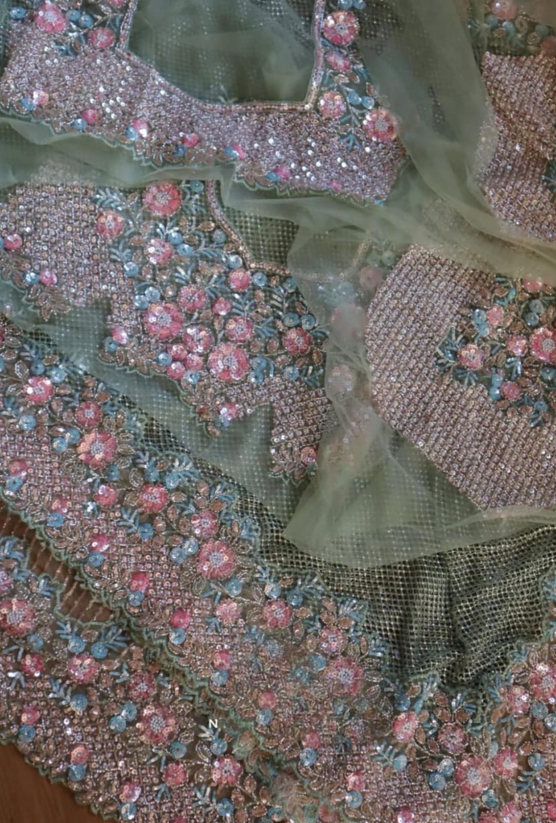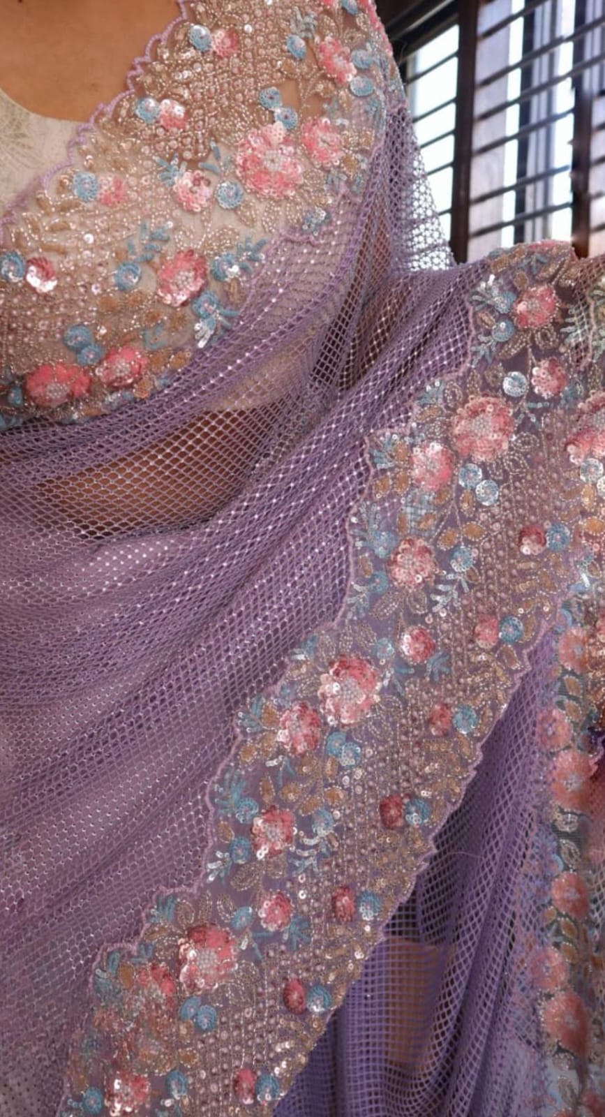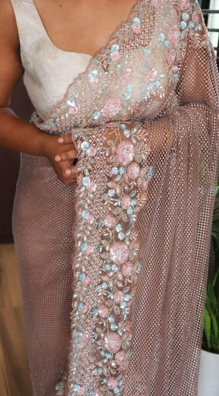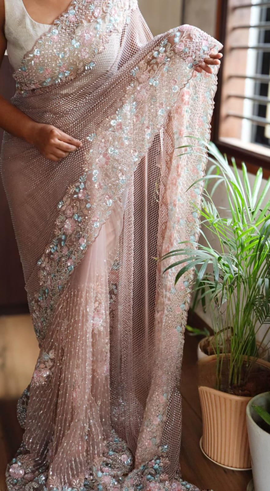 From the delicate shimmer of the mesh pallu to the intricate bursts of pink, aqua, and peach blooms, this drape is made for the woman who walks in elegance and leaves behind a little sparkle.