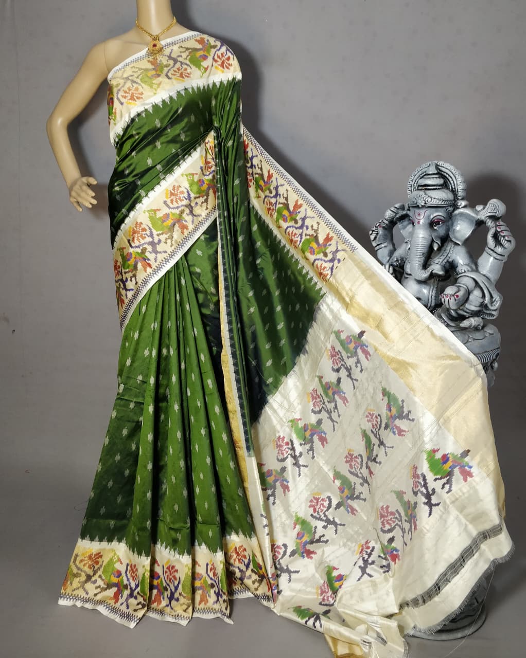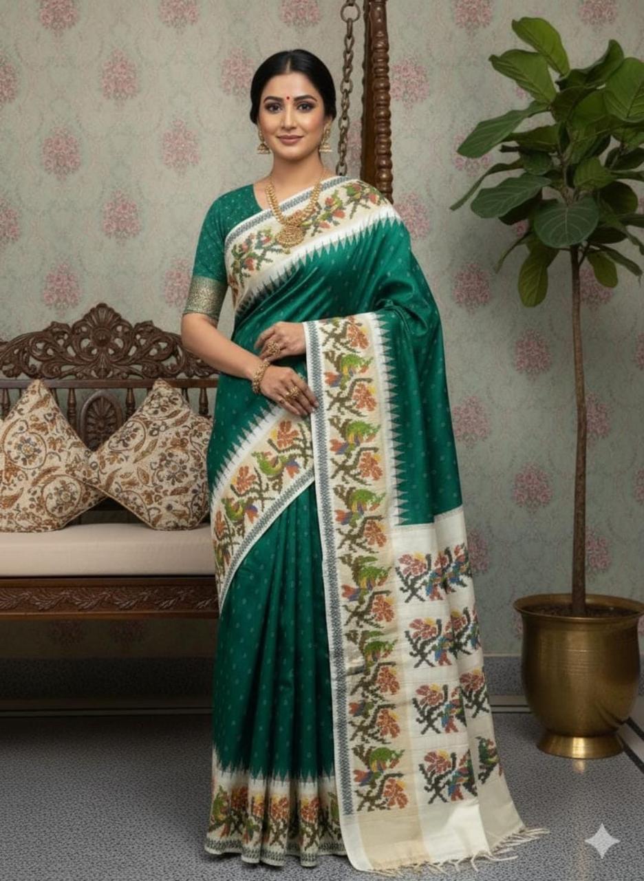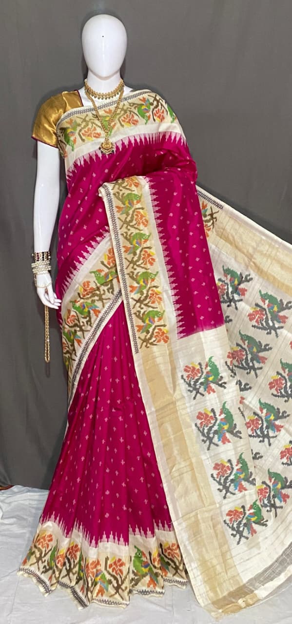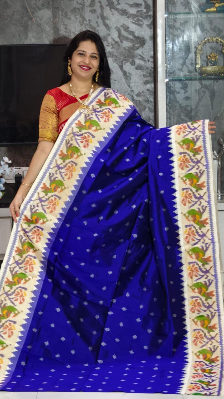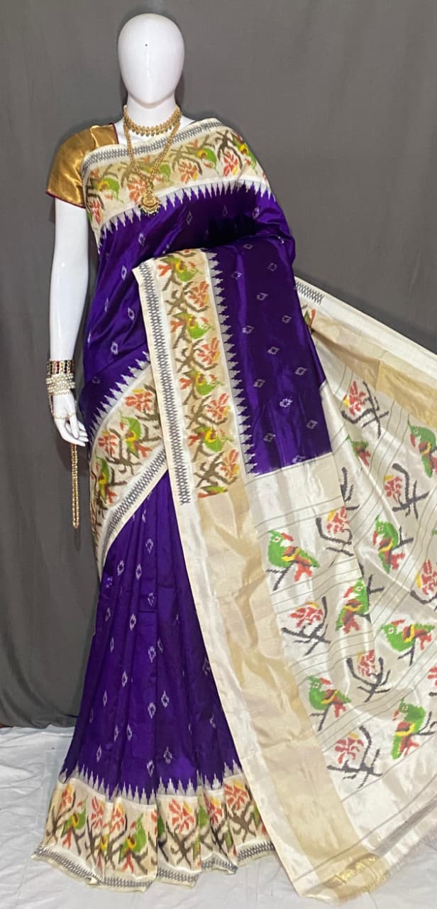 Each saree is carefully handwoven using premium-quality pure silk threads, offering a luxurious feel and graceful fall. The vibrant color combinations and symmetrical motifs make it a perfect choice for weddings, festive gatherings, and special occasions.