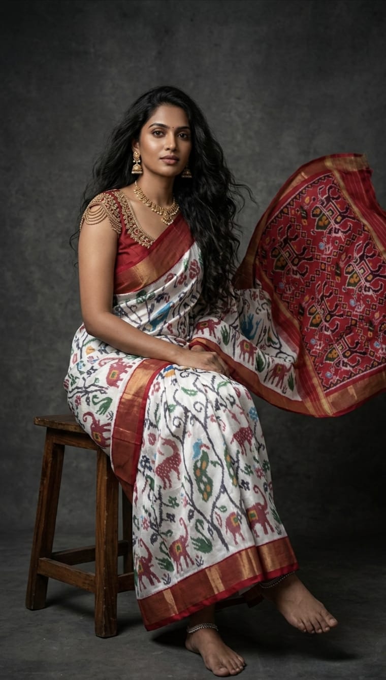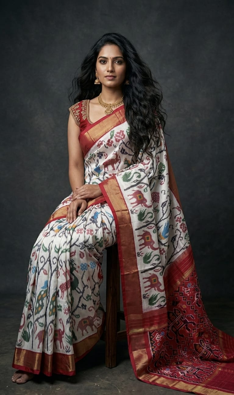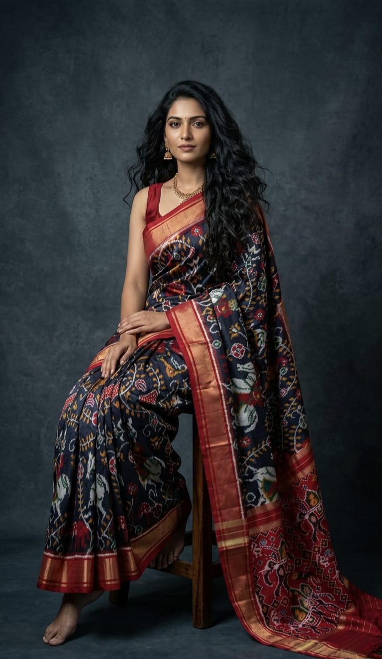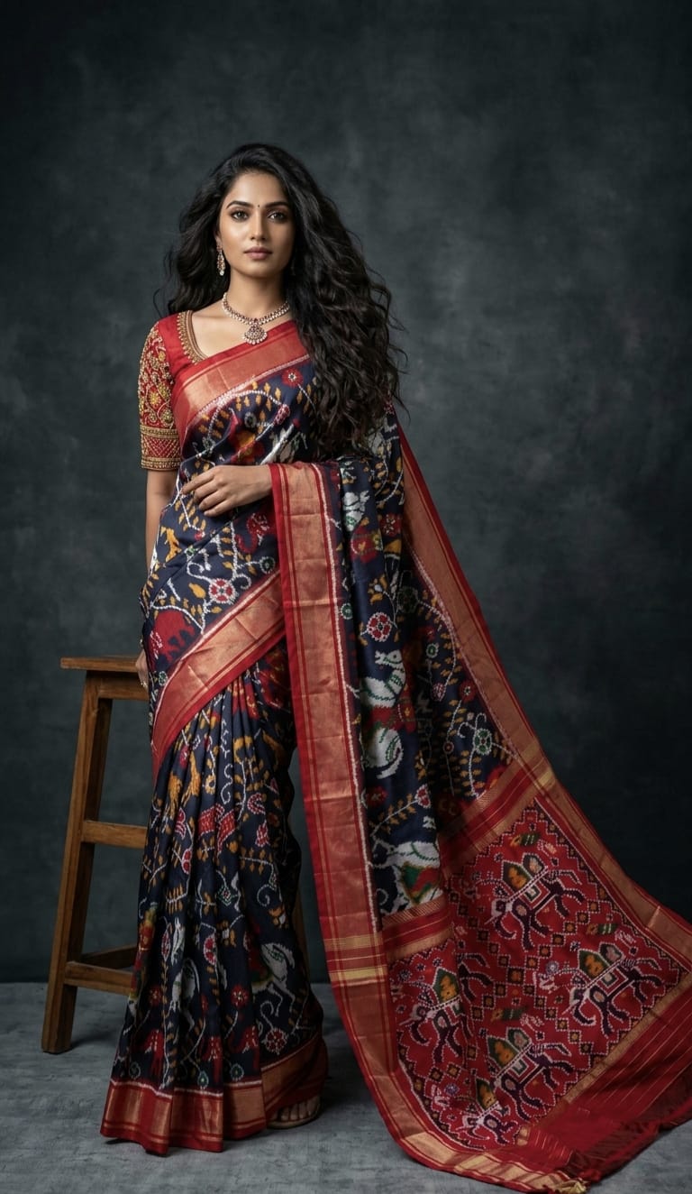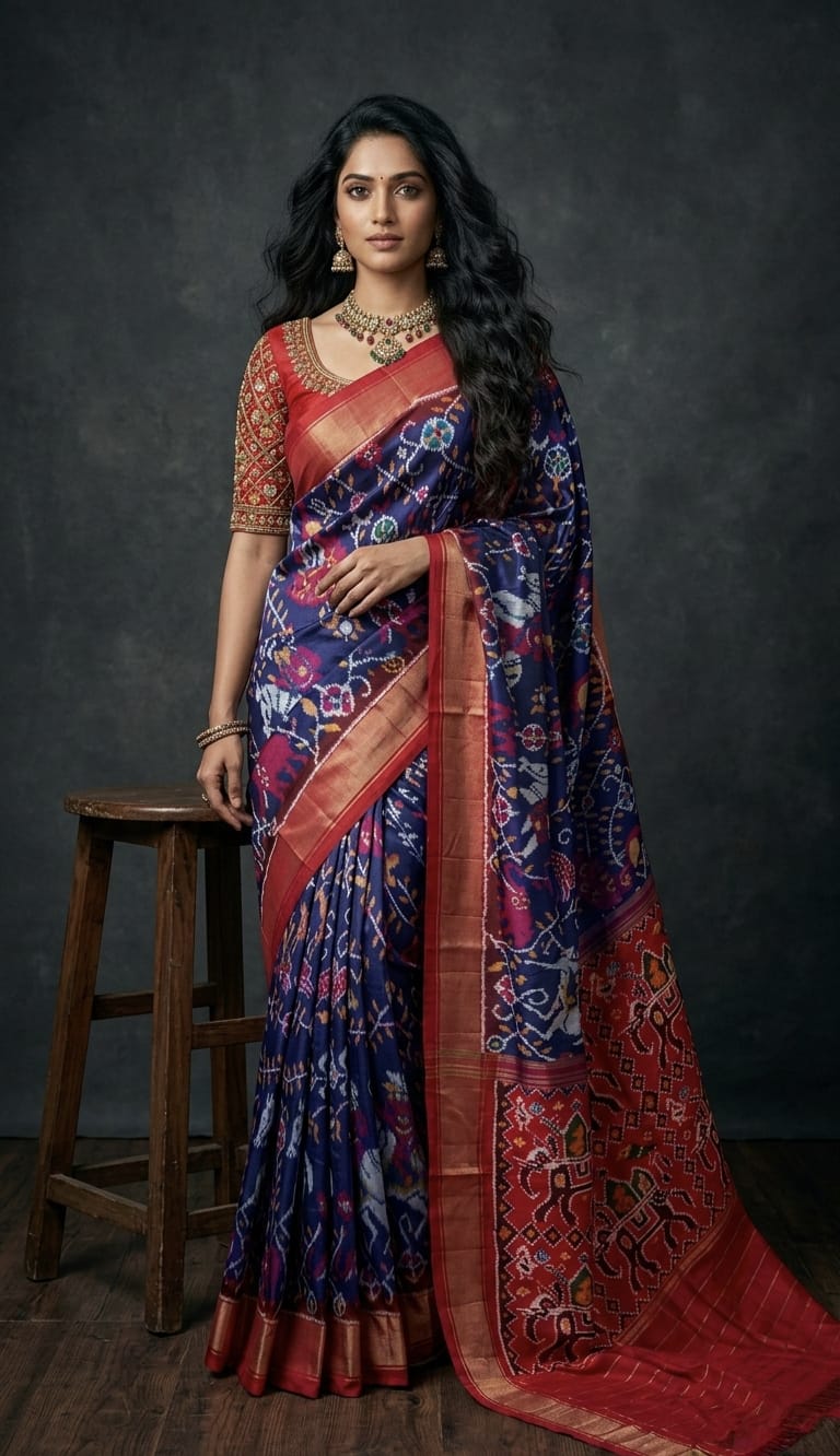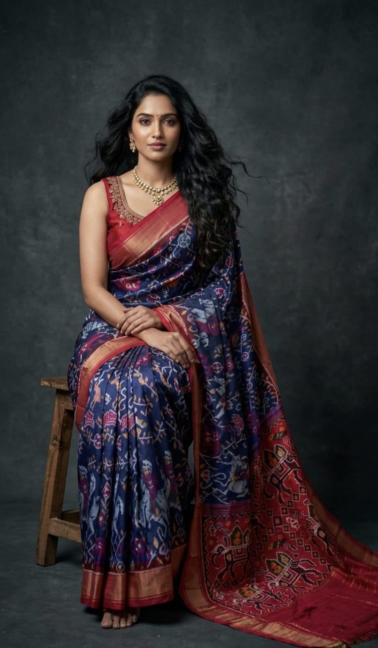 The Pochampally Pure Silk Saree is a symbol of South Indian weaving excellence. Originating from Bhoodan Pochampally, these sarees are famous for their intricate Ikat dyeing technique, where the yarns are tie-dyed before weaving to create stunning geometric and traditional patterns.