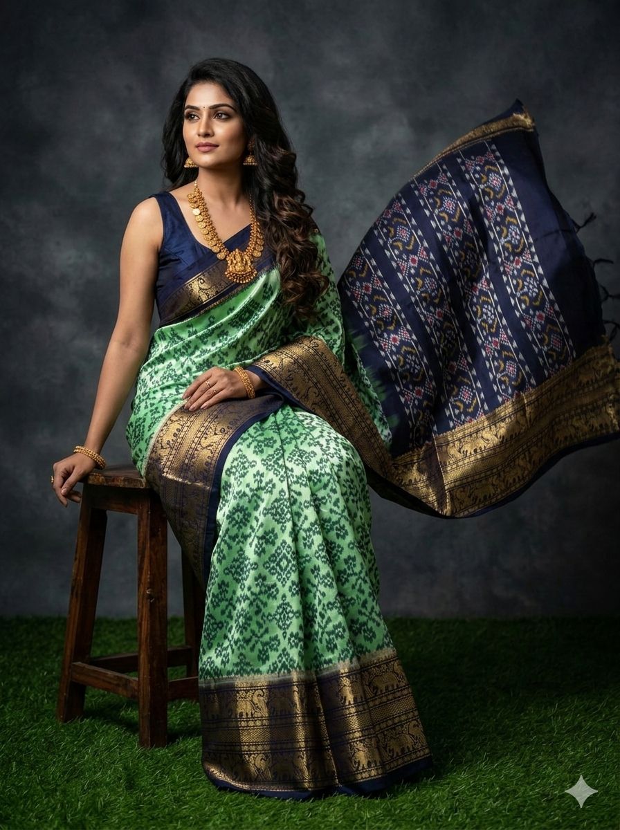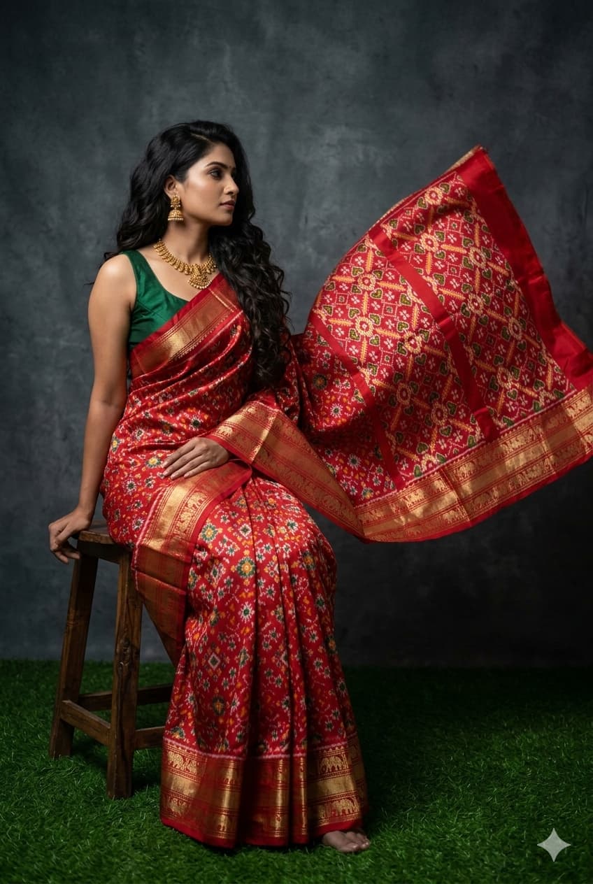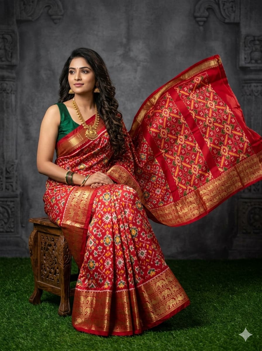 The Pochampally Pure Silk Saree is a symbol of South Indian weaving excellence. Originating from Bhoodan Pochampally, these sarees are famous for their intricate Ikat dyeing technique, where the yarns are tie-dyed before weaving to create stunning geometric and traditional patterns.